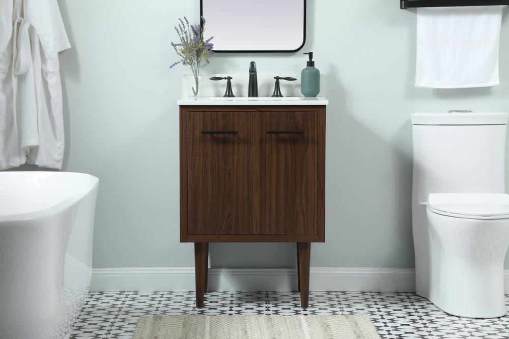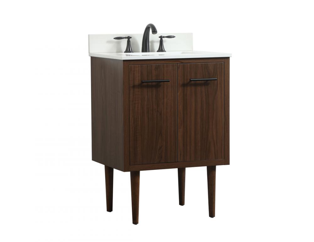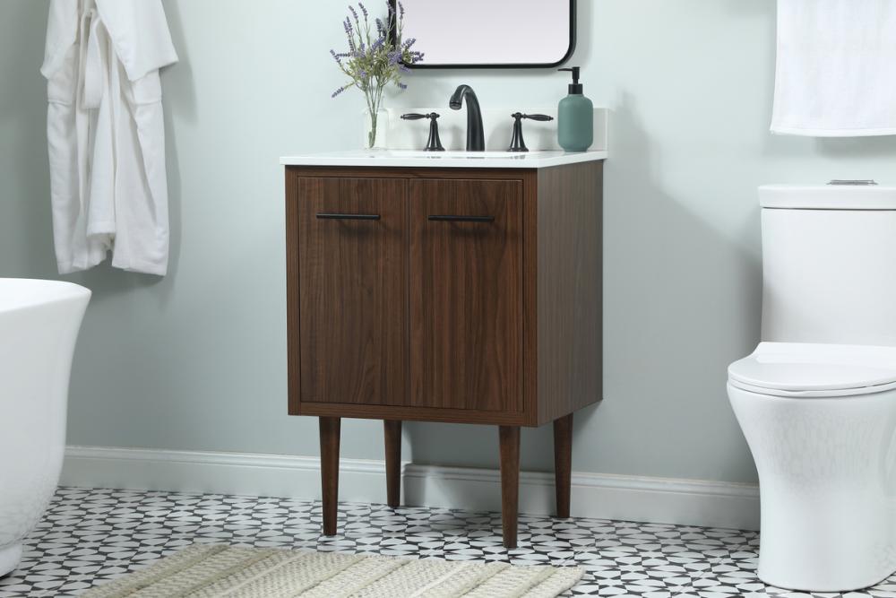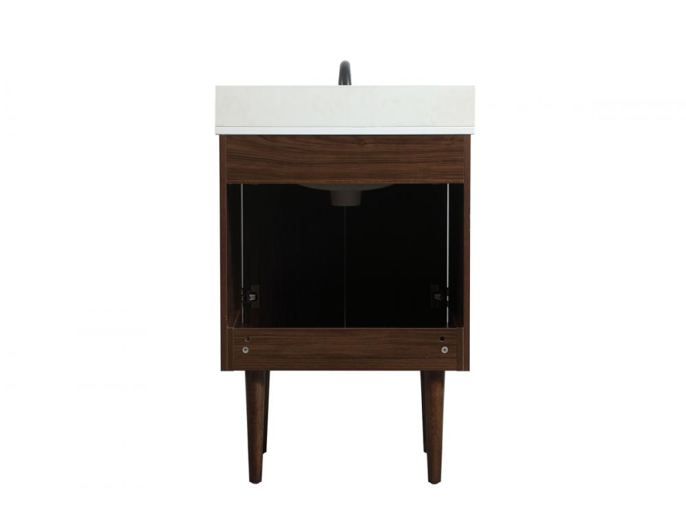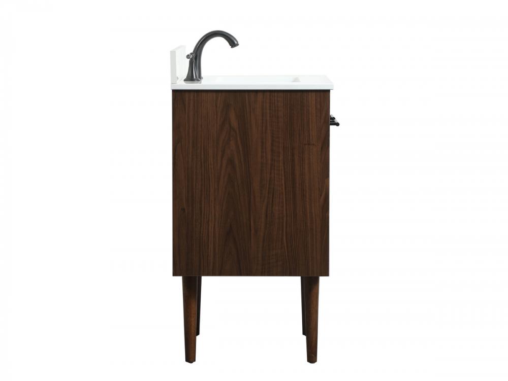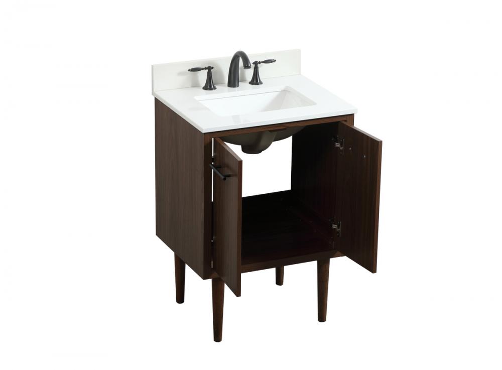 Delve into a world of minimalistic fashion and contemporary styling with this midcentury modern vanity. The clean lines anchors the design, while the straight tapered cylinder legs add subtle interest. Bar pull handle adorns the soft closing door hiding the base of the rectangular porcelain sink and letting you store your bathroom necessities and toiletries. The compact size makes it the perfect vanity for any bathroom or powder room, regardless of size. Whether you want to use this as a floating vanity or a freestanding vanity, the choice is yours. The durable ivory white engineered marble countertop complements the manufactured wood base vanity and is built to last. Comes with a matching backsplash to complete the look and protects your wall.