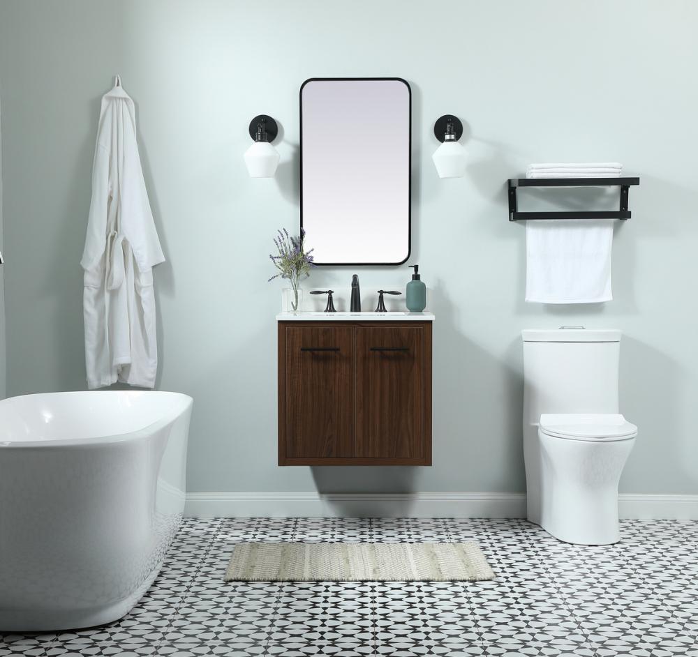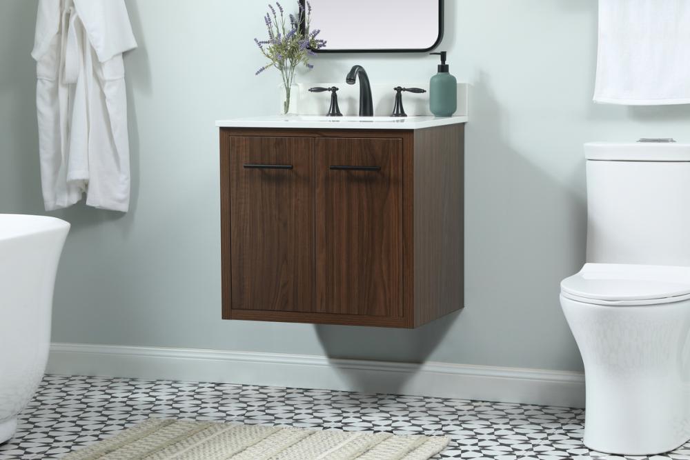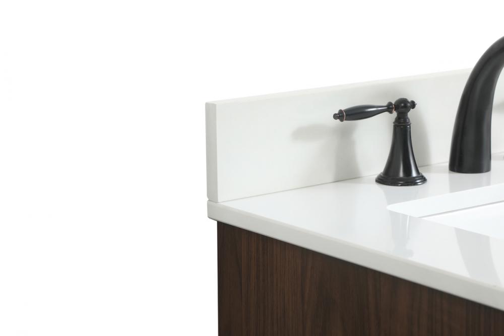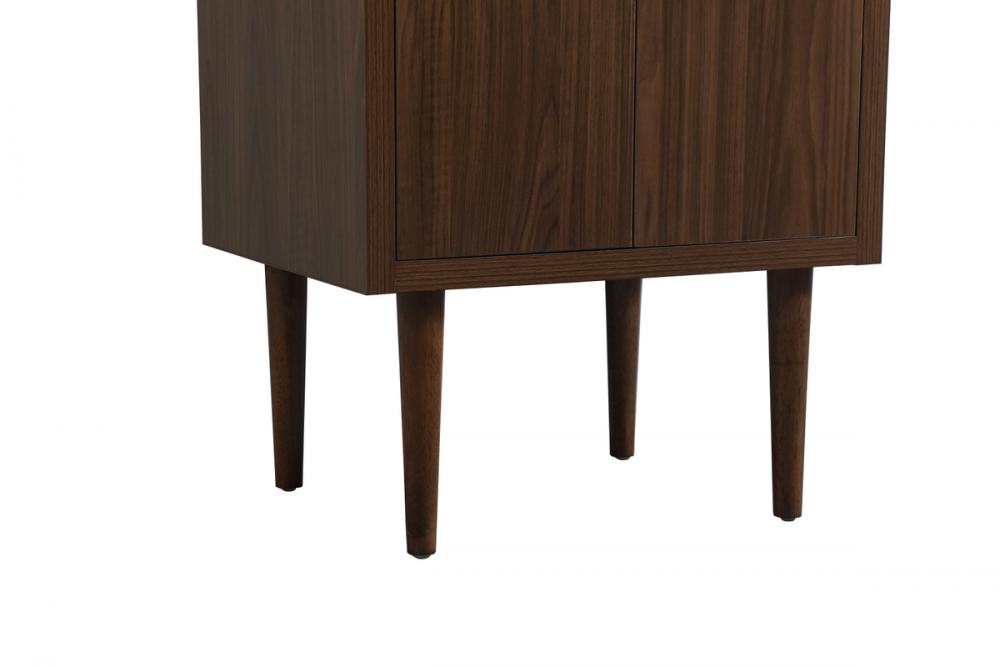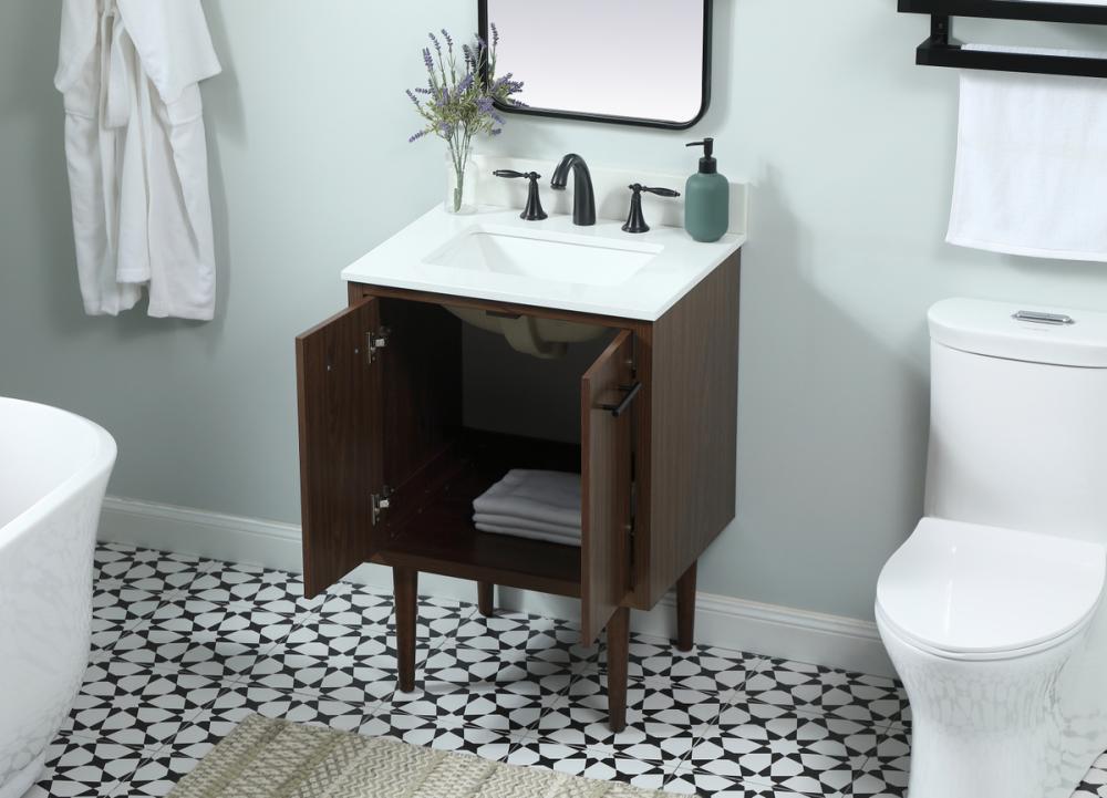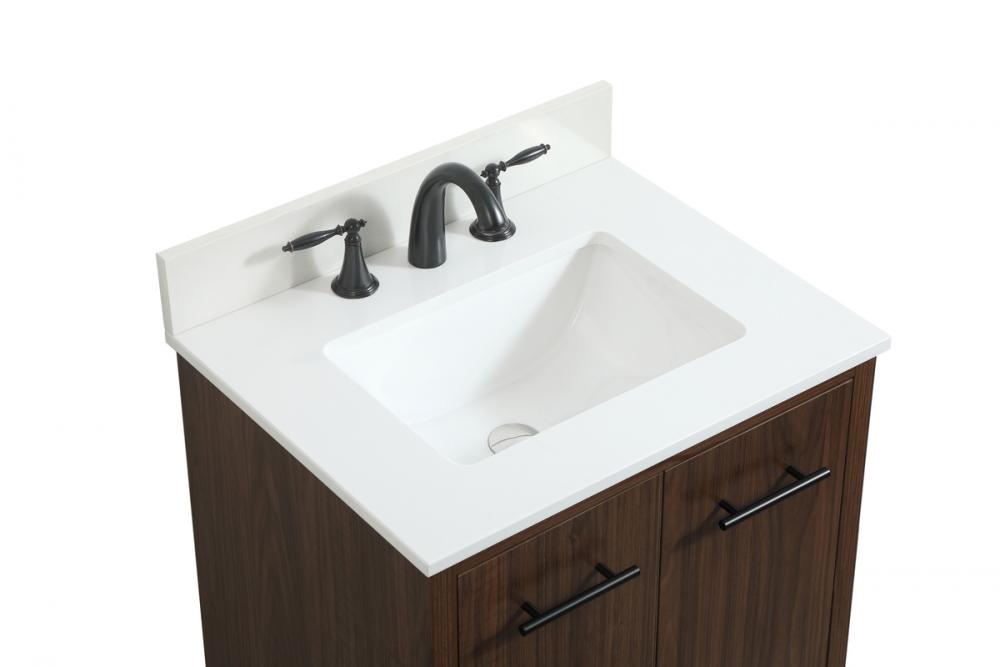 Delve into a world of minimalistic fashion and contemporary styling with this midcentury modern vanity. The clean lines anchors the design, while the straight tapered cylinder legs add subtle interest. Bar pull handle adorns the soft closing door hiding the base of the rectangular porcelain sink and letting you store your bathroom necessities and toiletries. The compact size makes it the perfect vanity for any bathroom or powder room, regardless of size. Whether you want to use this as a floating vanity or a freestanding vanity, the choice is yours. The durable ivory white engineered marble countertop complements the manufactured wood base vanity and is built to last. Comes with a matching backsplash to complete the look and protects your wall.