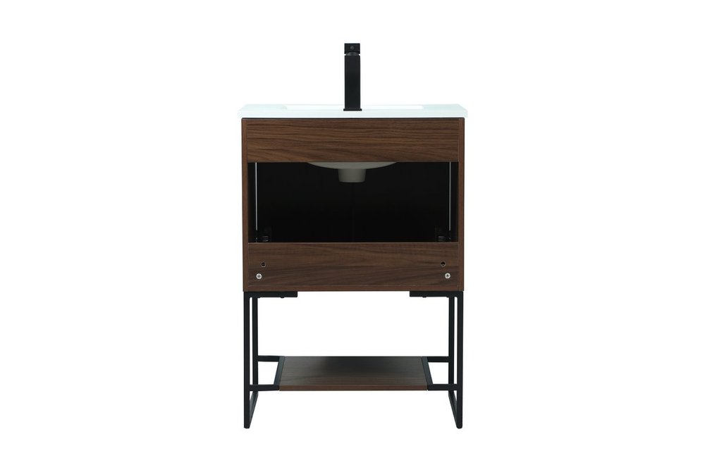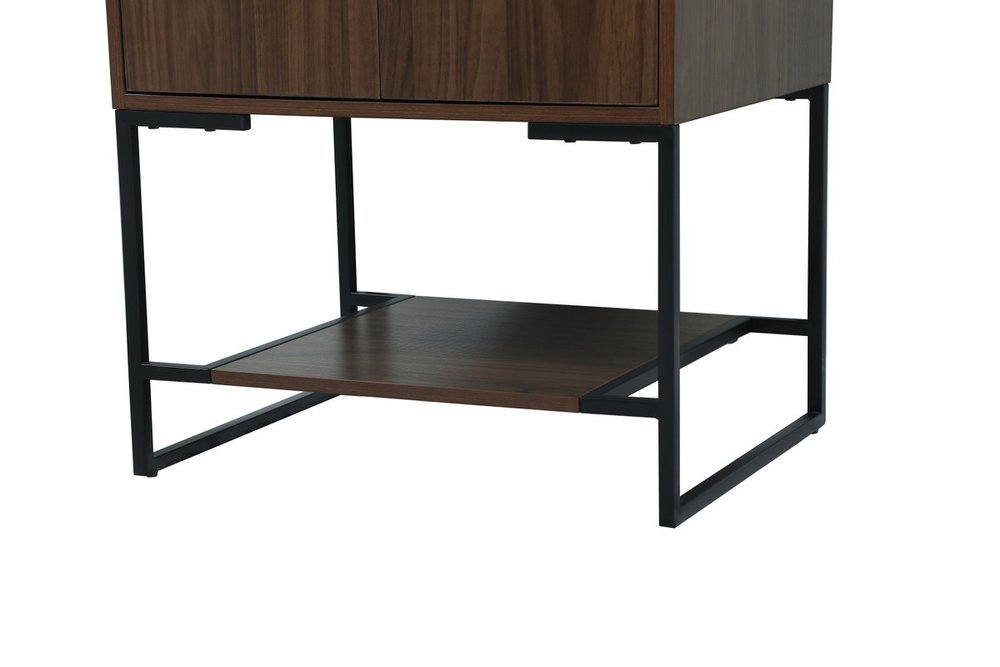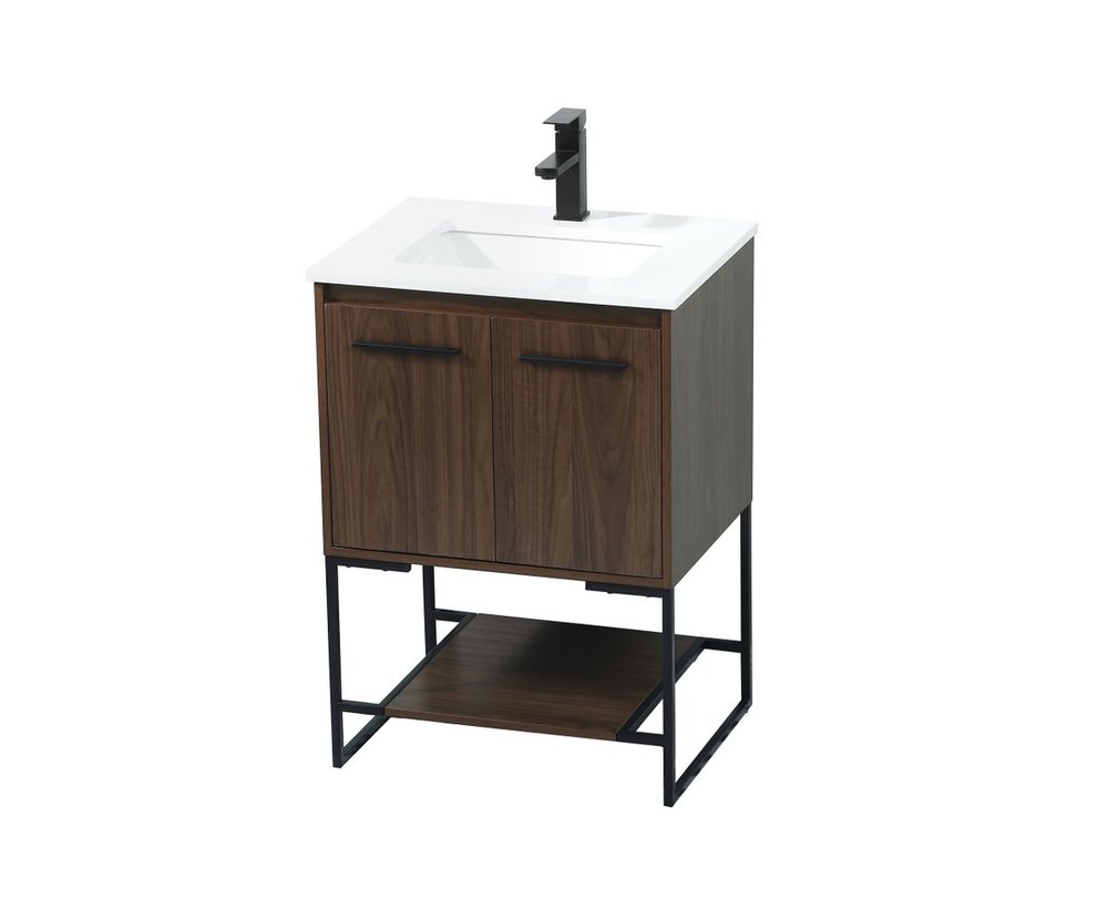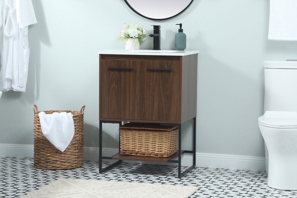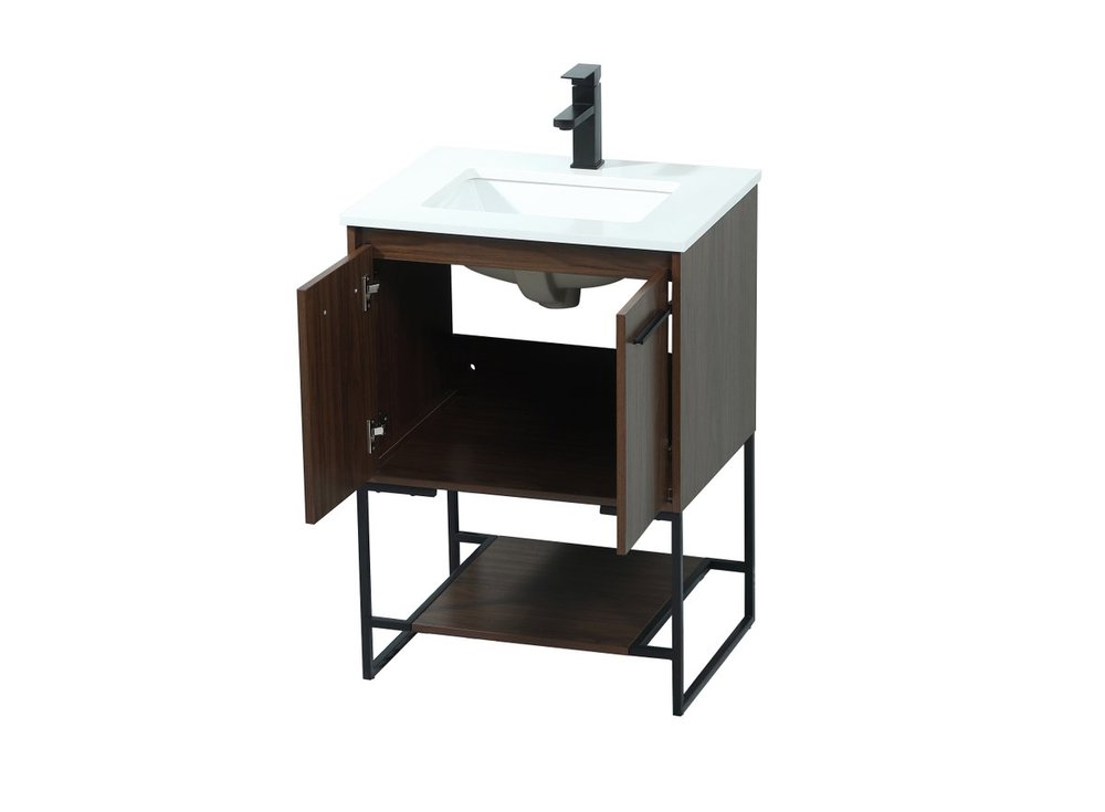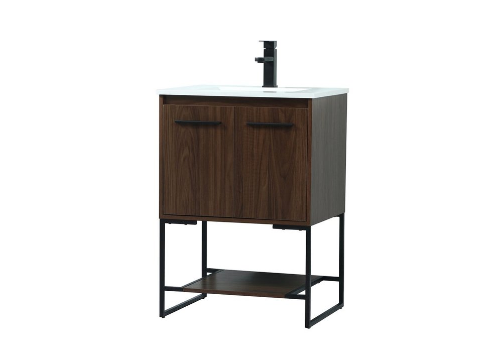 Live in modern comfort with this 24" walnut finish vanity. Dressed in a walnut and sleek black metal hardware, its contemporary style will have your bathroom or powder room elevated in industrial sophistication. The open shelf at the base and two doors reveal ample storage space for your bathroom essentials and miscellany. Clean lines create its own visual interest, adding trendy looks to your already chic room.