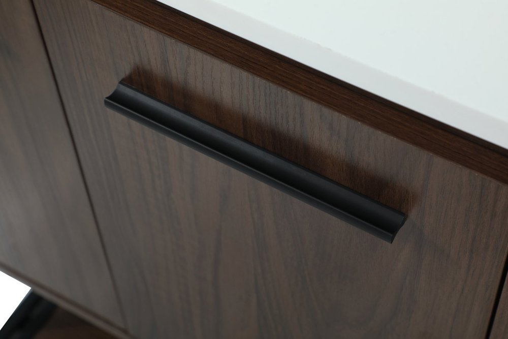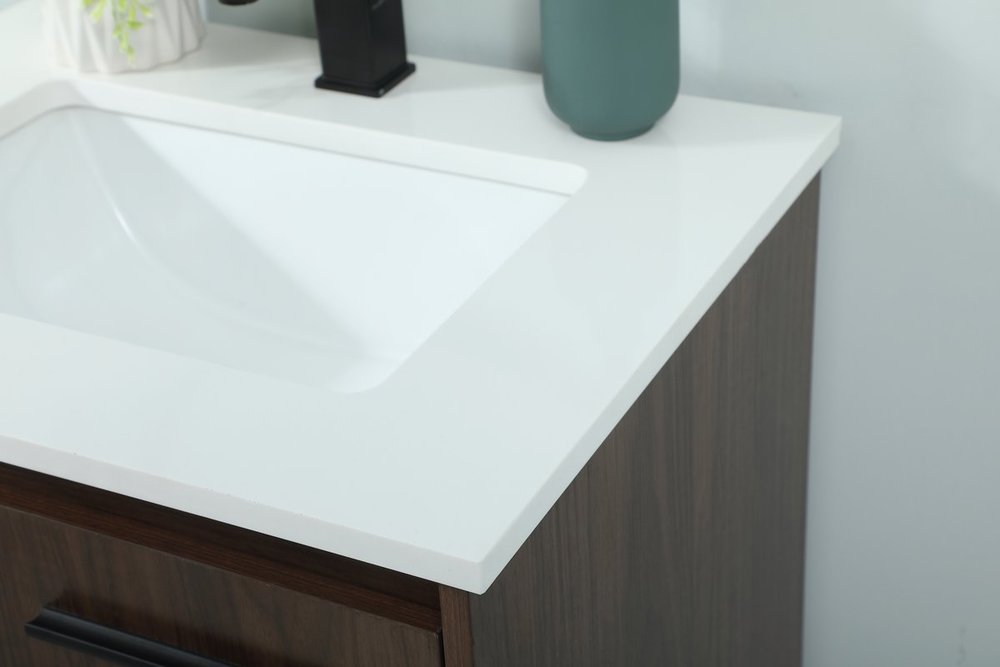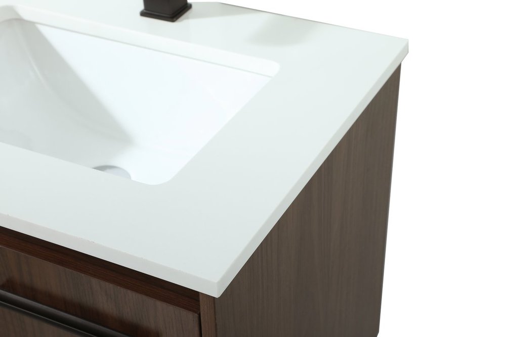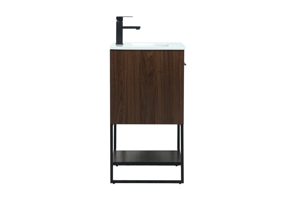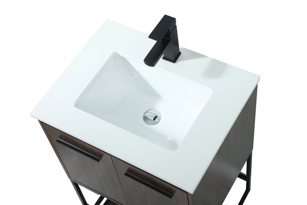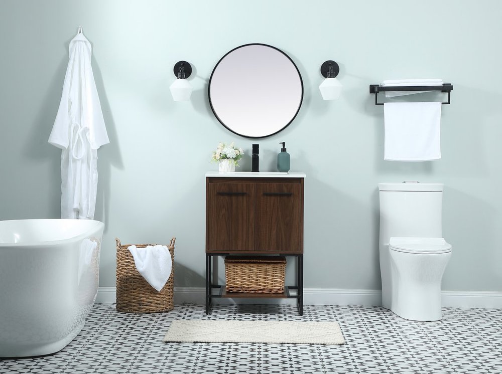 Live in modern comfort with this 24" walnut finish vanity. Dressed in a walnut and sleek black metal hardware, its contemporary style will have your bathroom or powder room elevated in industrial sophistication. The open shelf at the base and two doors reveal ample storage space for your bathroom essentials and miscellany. Clean lines create its own visual interest, adding trendy looks to your already chic room.