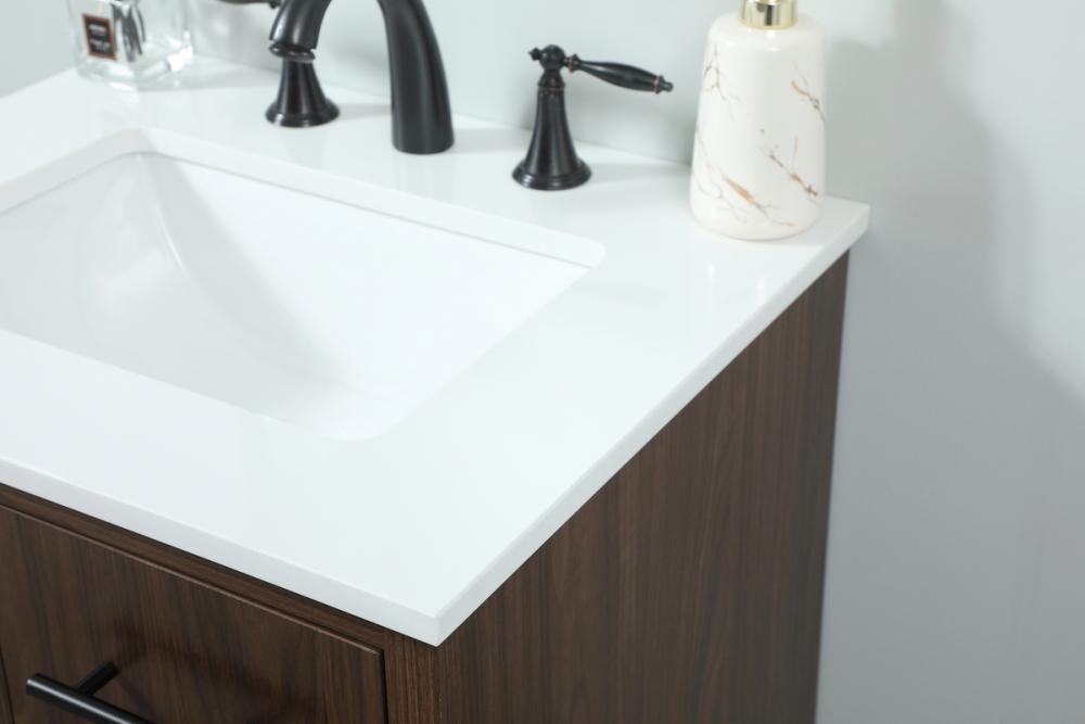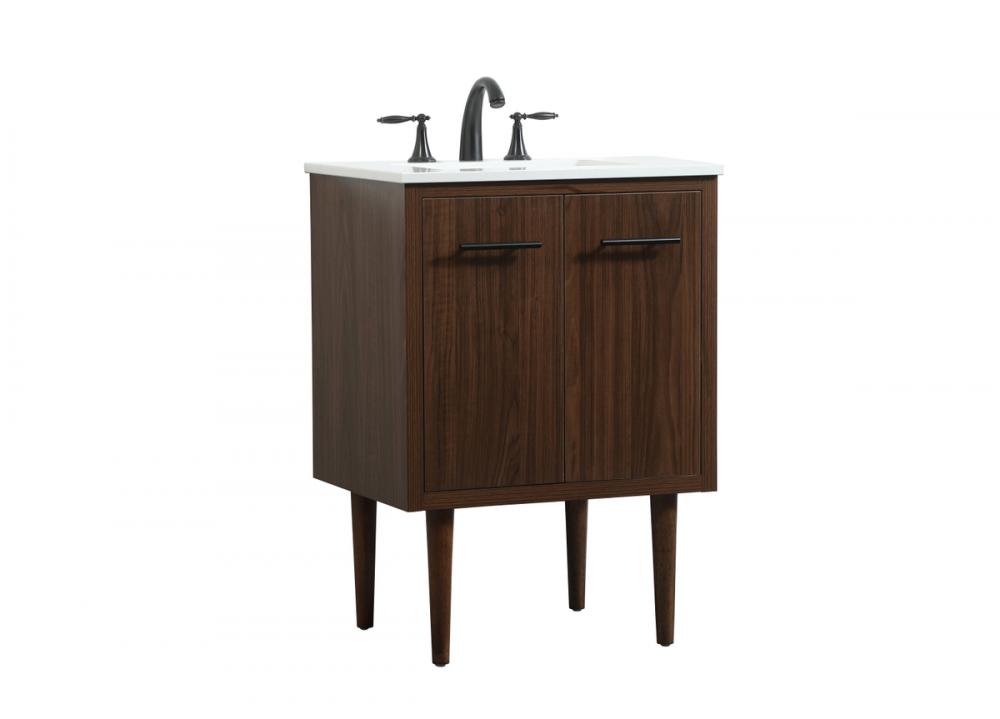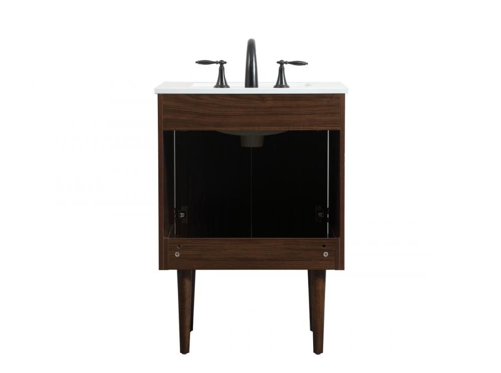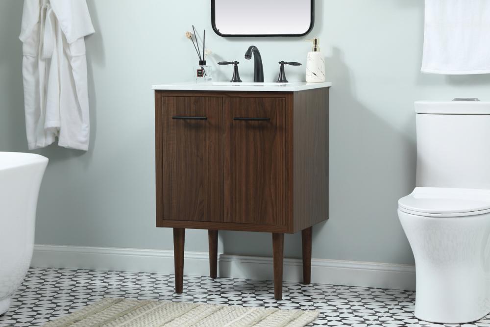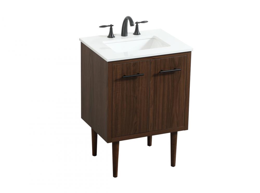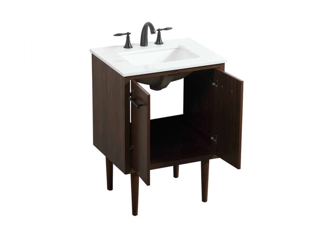 Delve into a world of minimalistic fashion and contemporary styling with this midcentury modern vanity. The clean lines anchors the design, while the straight tapered cylinder legs add subtle interest. Bar pull handle adorns the soft closing door hiding the base of the rectangular porcelain sink and letting you store your bathroom necessities and toiletries. The compact size makes it the perfect vanity for any bathroom or powder room, regardless of size. Whether you want to use this as a floating vanity or a freestanding vanity, the choice is yours. The durable ivory white engineered marble countertop complements the manufactured wood base vanity and is built to last.