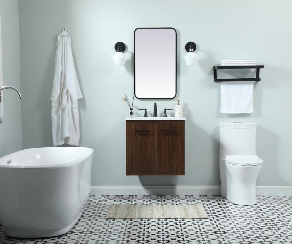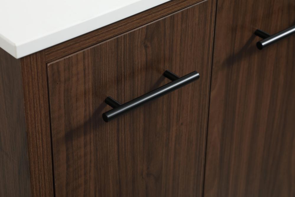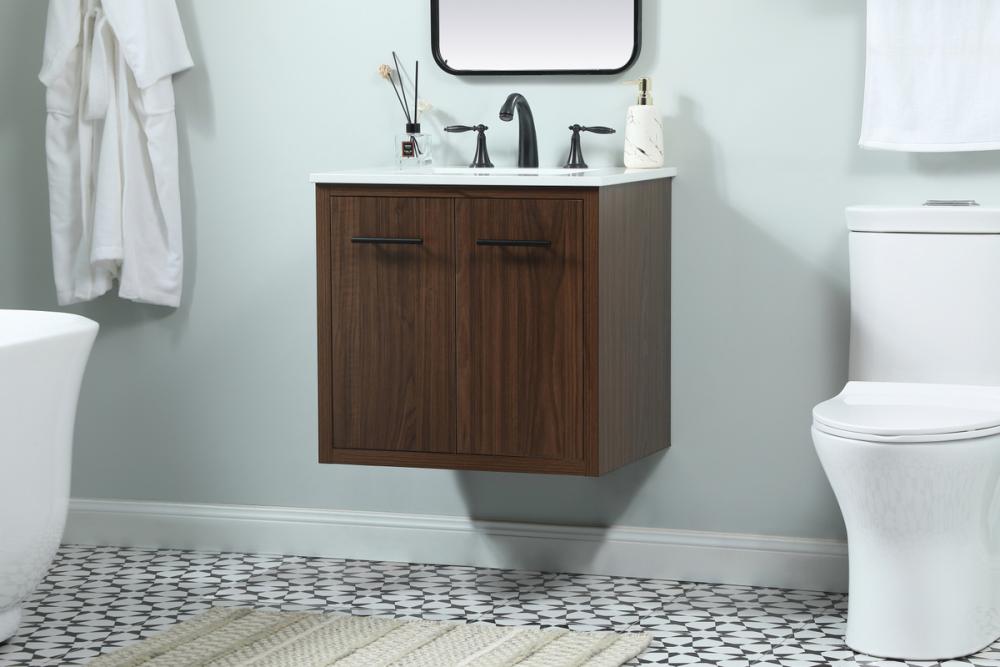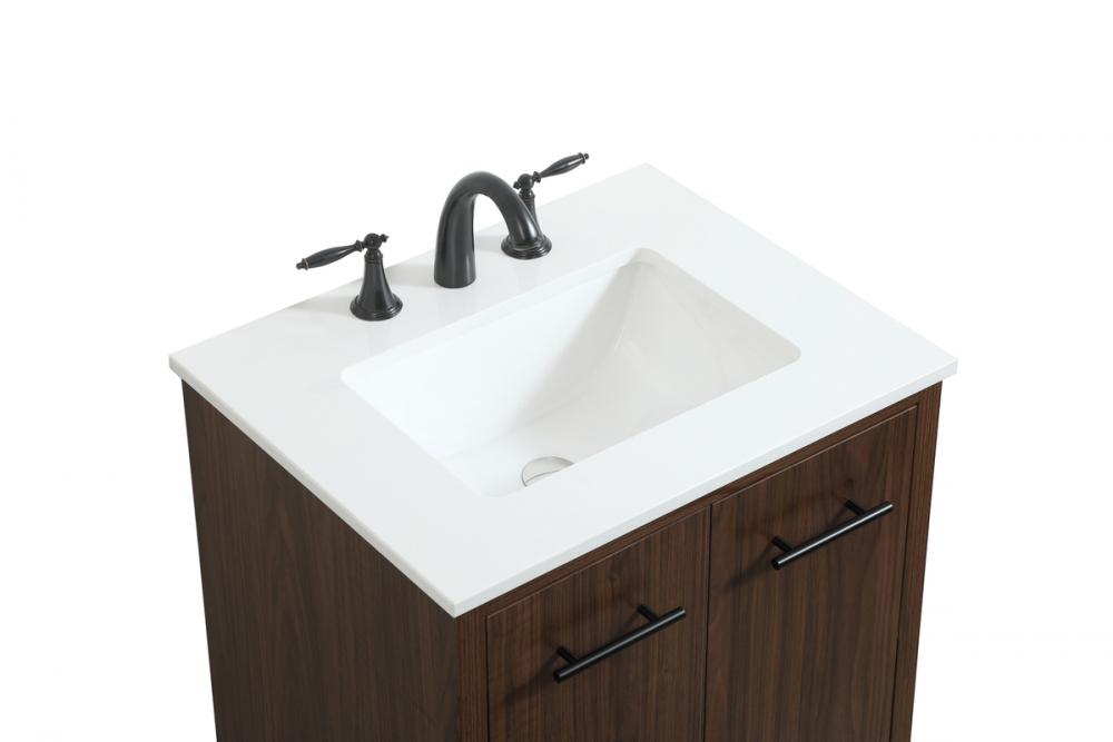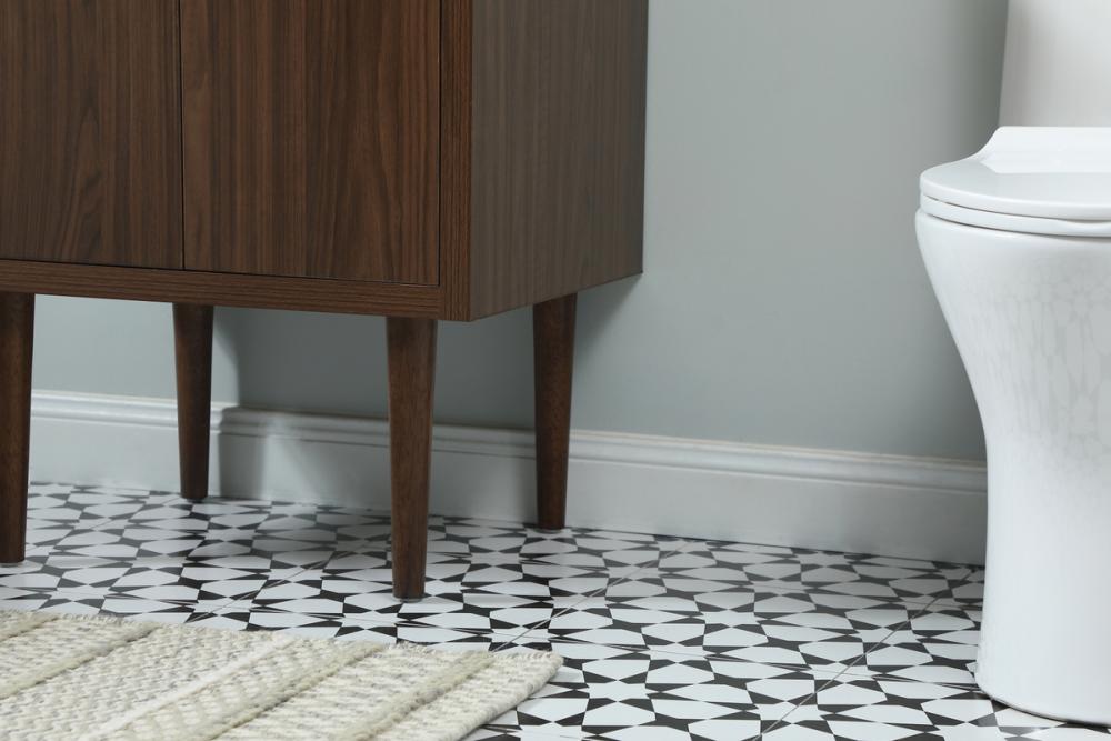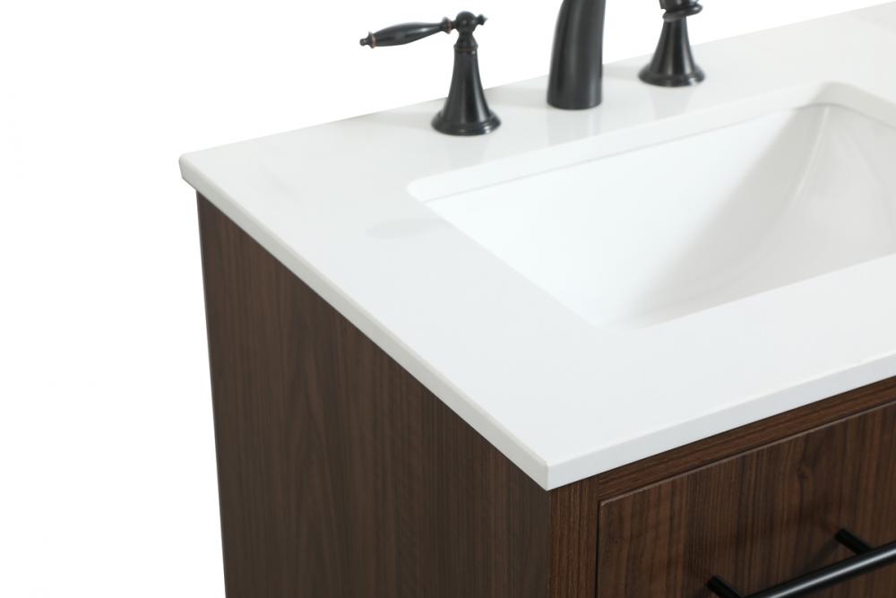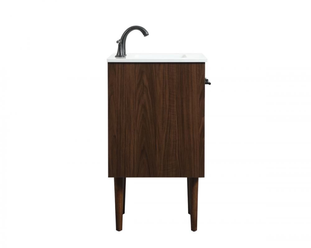 Delve into a world of minimalistic fashion and contemporary styling with this midcentury modern vanity. The clean lines anchors the design, while the straight tapered cylinder legs add subtle interest. Bar pull handle adorns the soft closing door hiding the base of the rectangular porcelain sink and letting you store your bathroom necessities and toiletries. The compact size makes it the perfect vanity for any bathroom or powder room, regardless of size. Whether you want to use this as a floating vanity or a freestanding vanity, the choice is yours. The durable ivory white engineered marble countertop complements the manufactured wood base vanity and is built to last.