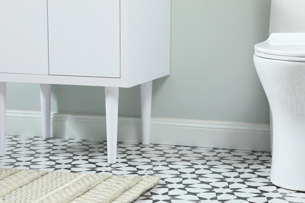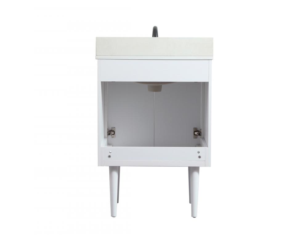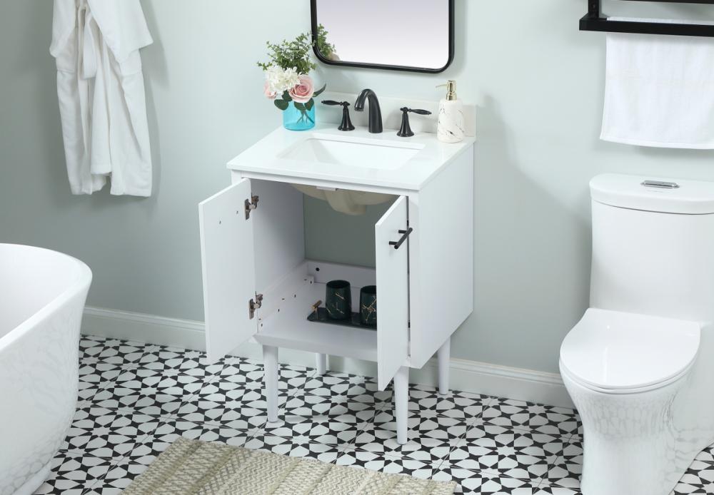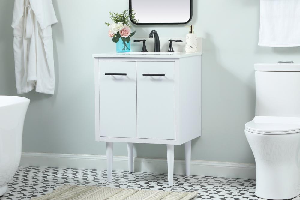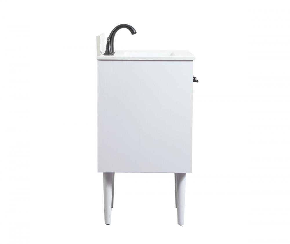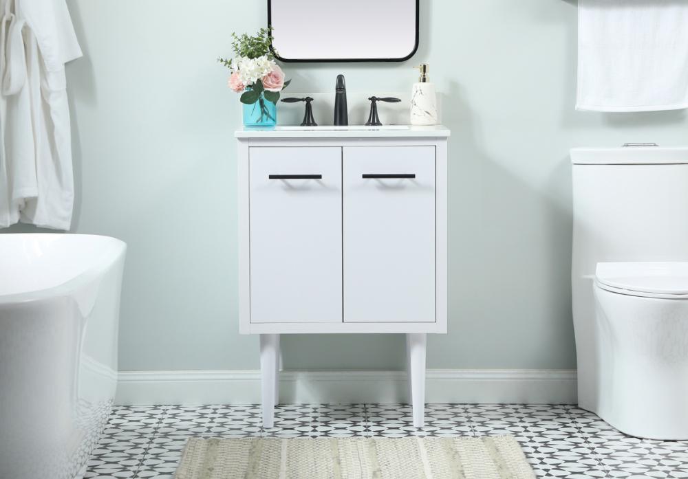 Delve into a world of minimalistic fashion and contemporary styling with this midcentury modern vanity. The clean lines anchors the design, while the straight tapered cylinder legs add subtle interest. Bar pull handle adorns the soft closing door hiding the base of the rectangular porcelain sink and letting you store your bathroom necessities and toiletries. The compact size makes it the perfect vanity for any bathroom or powder room, regardless of size. Whether you want to use this as a floating vanity or a freestanding vanity, the choice is yours. The durable ivory white engineered marble countertop complements the manufactured wood base vanity and is built to last. Comes with a matching backsplash to complete the look and protects your wall.