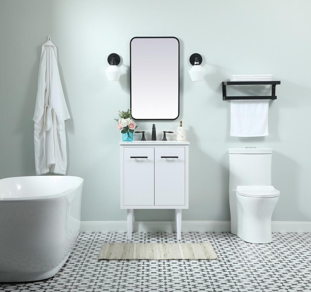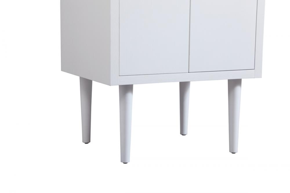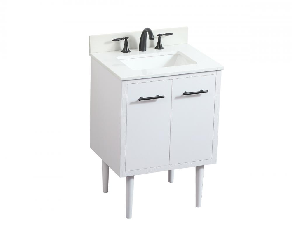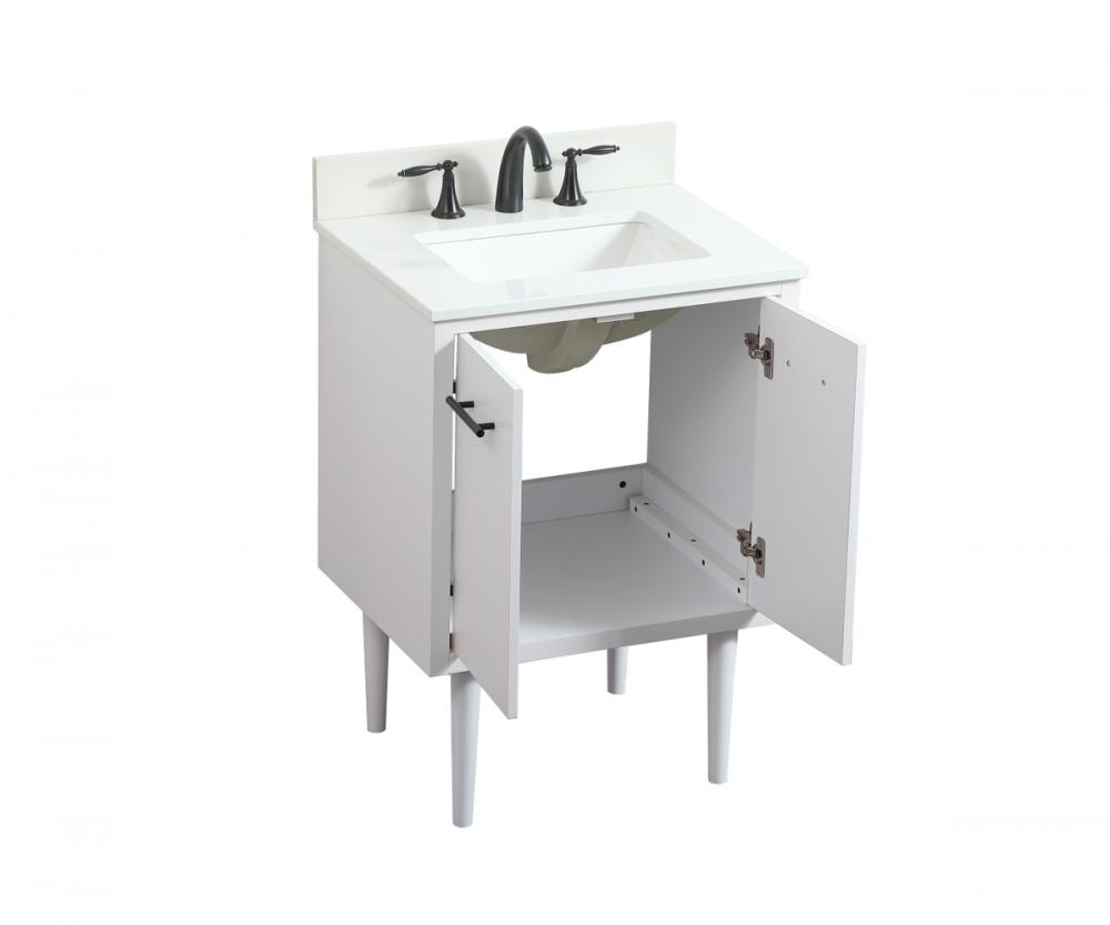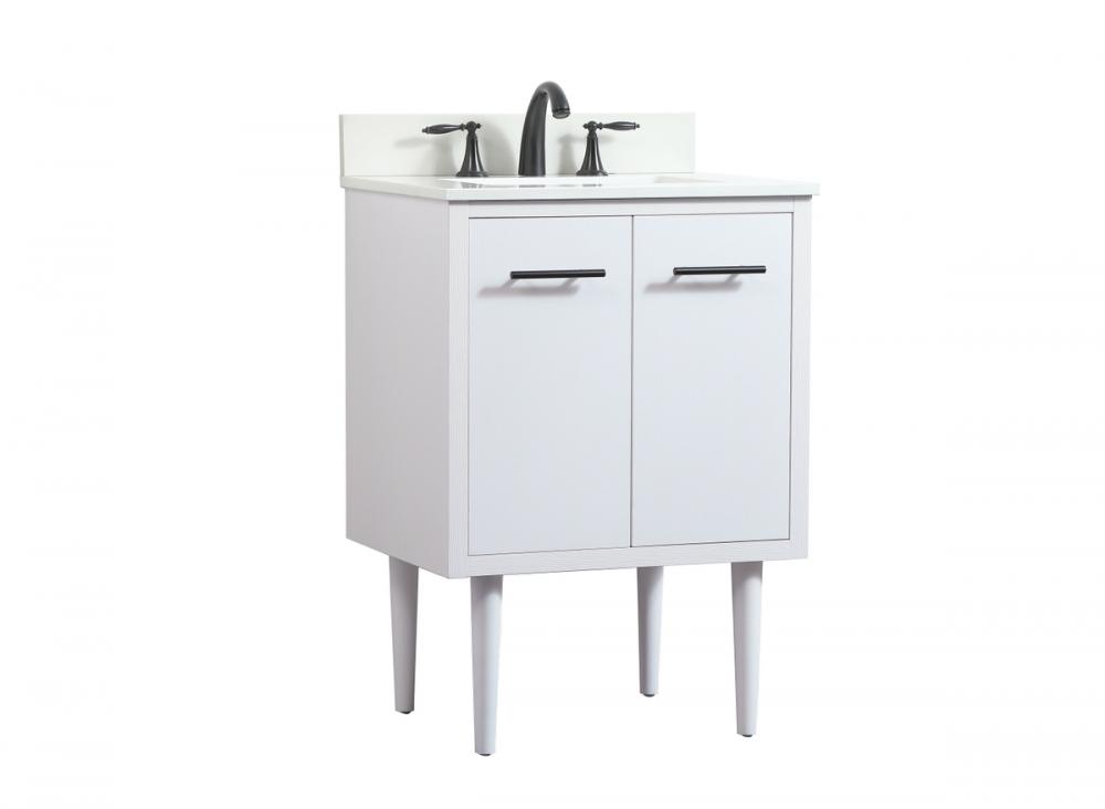 Delve into a world of minimalistic fashion and contemporary styling with this midcentury modern vanity. The clean lines anchors the design, while the straight tapered cylinder legs add subtle interest. Bar pull handle adorns the soft closing door hiding the base of the rectangular porcelain sink and letting you store your bathroom necessities and toiletries. The compact size makes it the perfect vanity for any bathroom or powder room, regardless of size. Whether you want to use this as a floating vanity or a freestanding vanity, the choice is yours. The durable ivory white engineered marble countertop complements the manufactured wood base vanity and is built to last. Comes with a matching backsplash to complete the look and protects your wall.