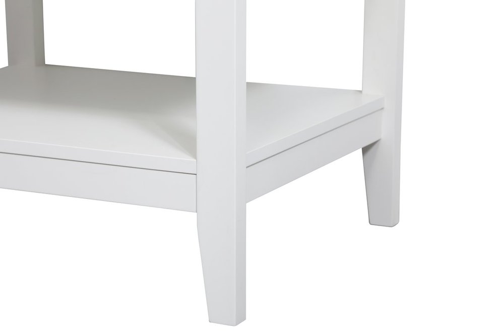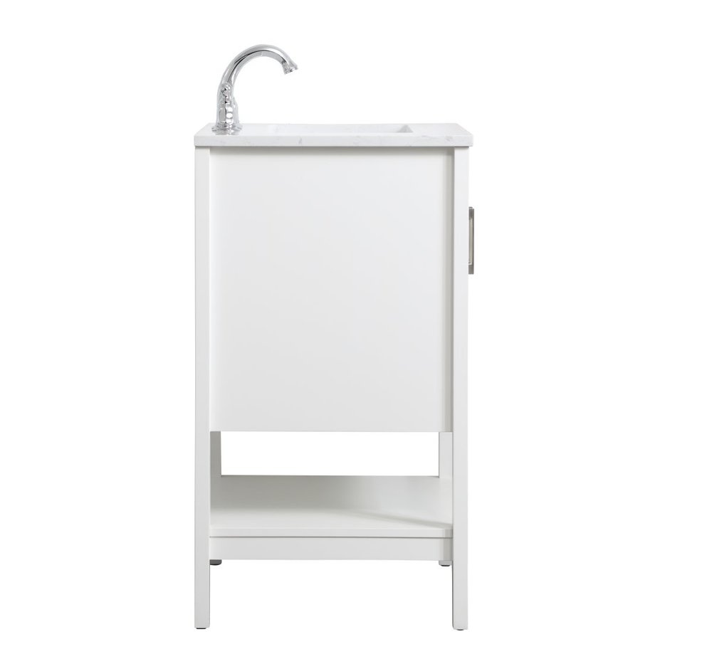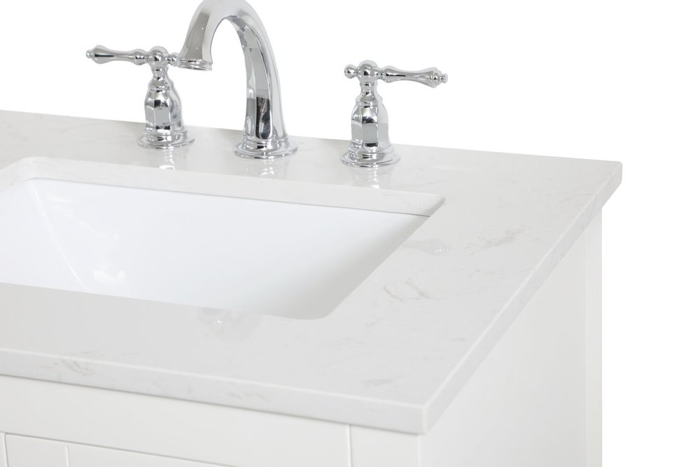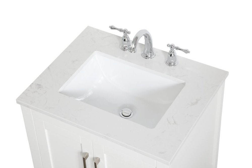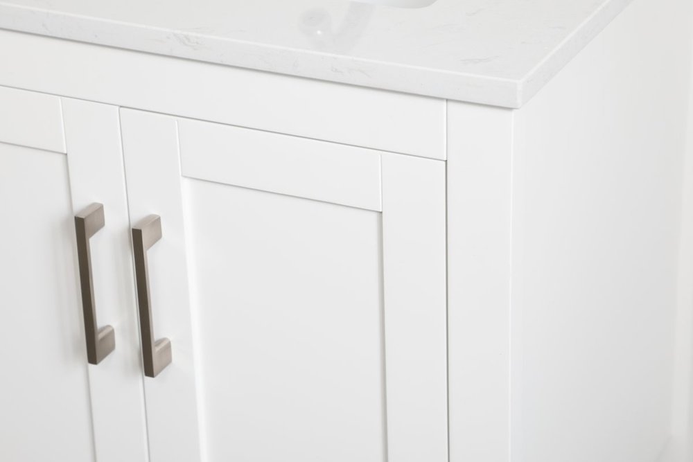 The nonchalant attitude of this 24" traditional white finish vanity will have you wanting more. The slender brushed nickel handle bars open the two cabinet doors to reveal ample storage space to put away and store bathroom essentials, and the open space below allows for you to place clean towels on the rack. Topped with a calacatta engineered marble countertop, you and your guests will enjoy this easy going vanity.