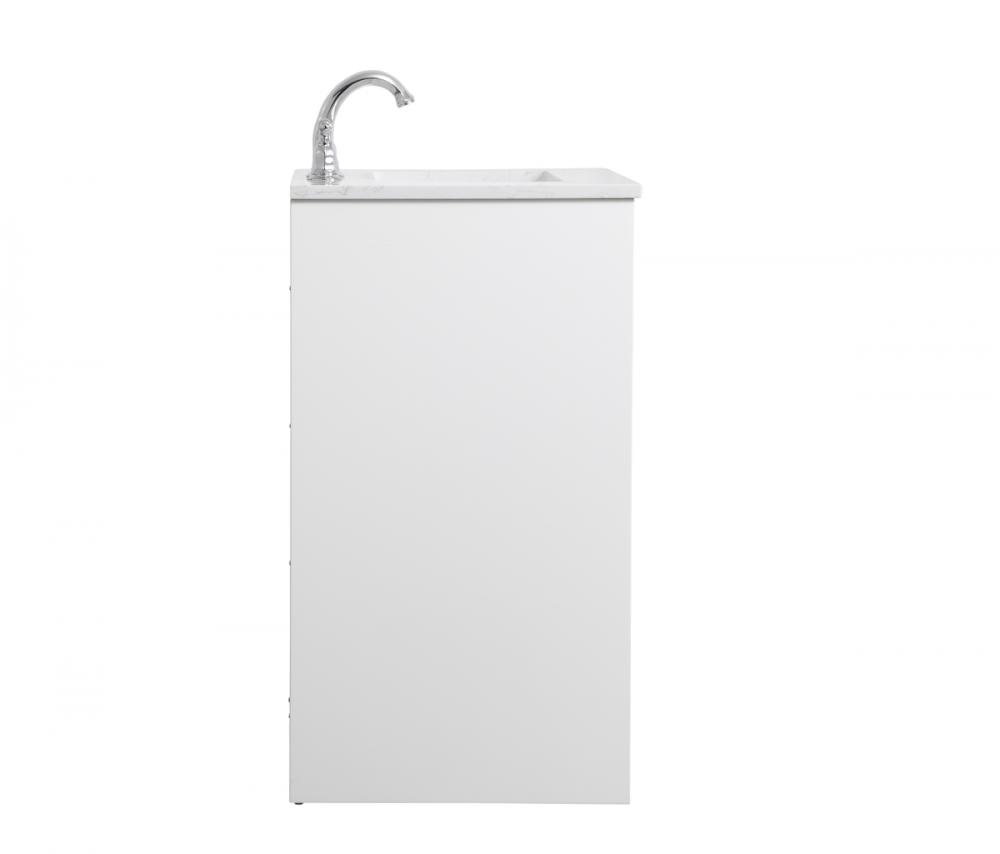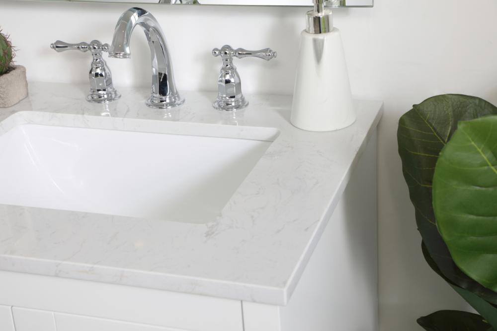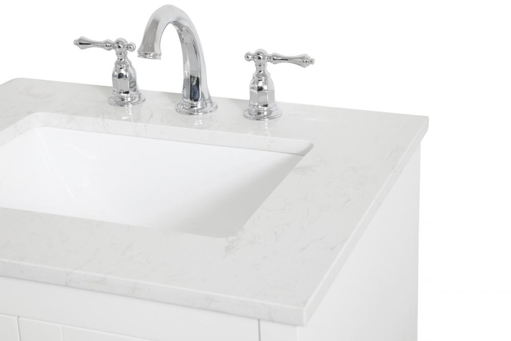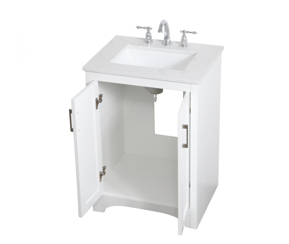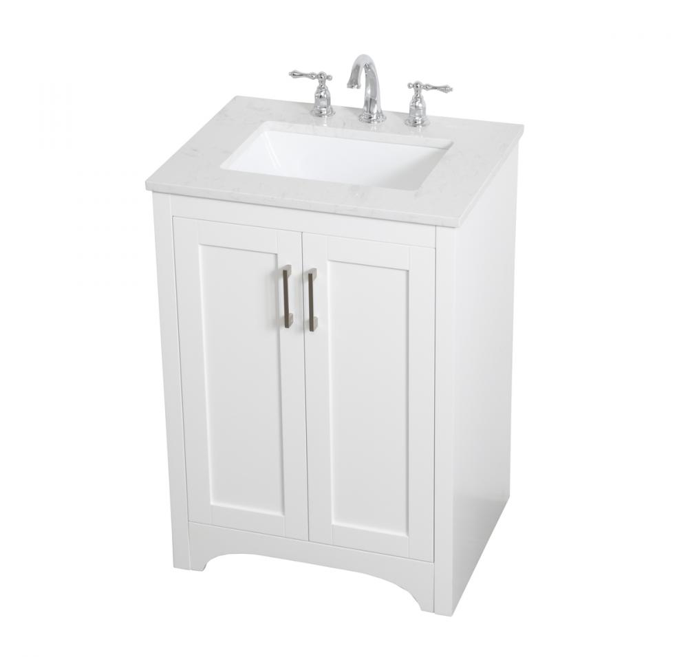 The refined simplicity of this 24" white finish vanity creates a peaceful, yet stylish, atmosphere. Its traditional modernity adds a mature beauty that will elevate any bathroom or powder room--the Calacatta engineered marble counter top adds refined luxe while the brushed nickel handle bars open the two cabinet doors, revealing ample storage space to store and hide away an assortment of bathroom essentials. Whether your home is large or small, this vanity will surely fit in well.