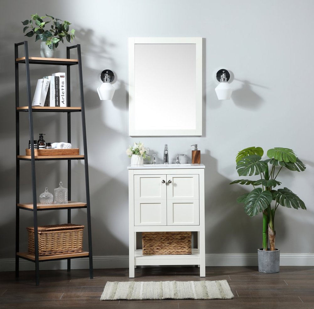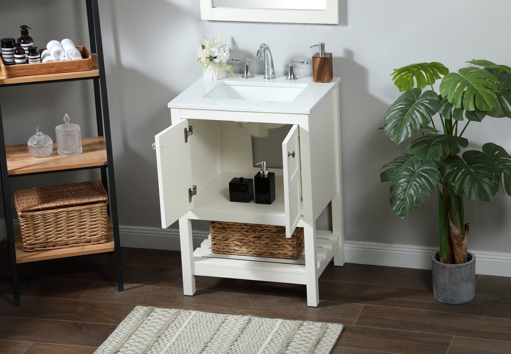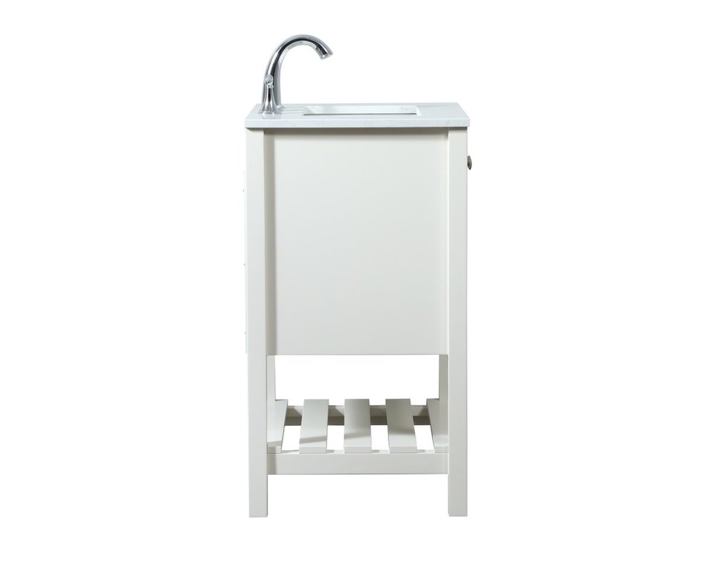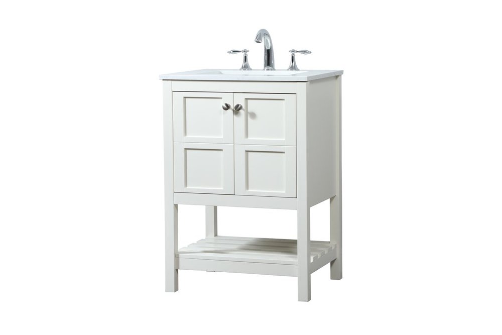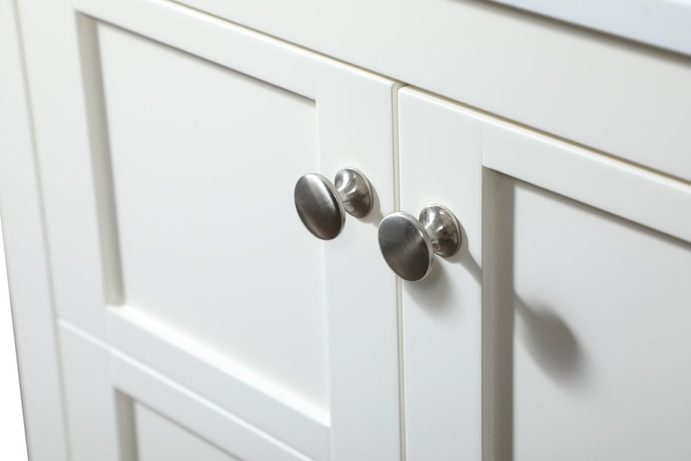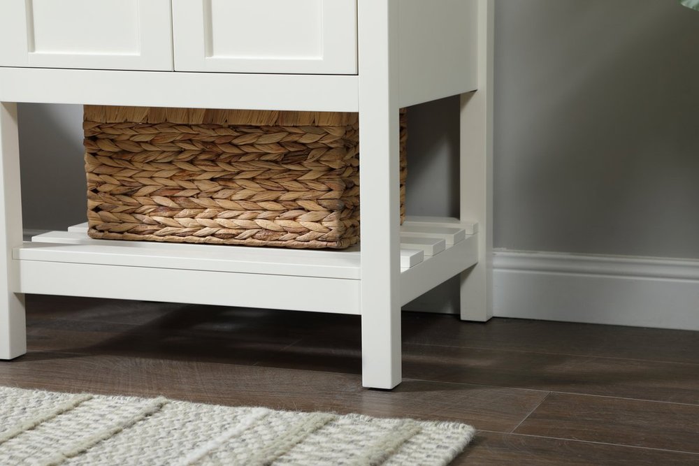 The subtle beauty of the Theo collection vanity exudes comfortable luxury. Its modern, yet traditional beauty will surely dress up your bathroom or powder room without any fuss. The calacatta engineered marble countertop and porcelain undermount sink shows quiet opulence, and the legs support upright without fail. Brushed nickel hardware complements the classic white finish, with pulls adorning the two cabinet doors, showcasing ample storage space within. Slated shelf allows for additional space to organize your towels. Whether this vanity is in your bathroom or for guests, its presence will surely elevate the aesthetics of your room.