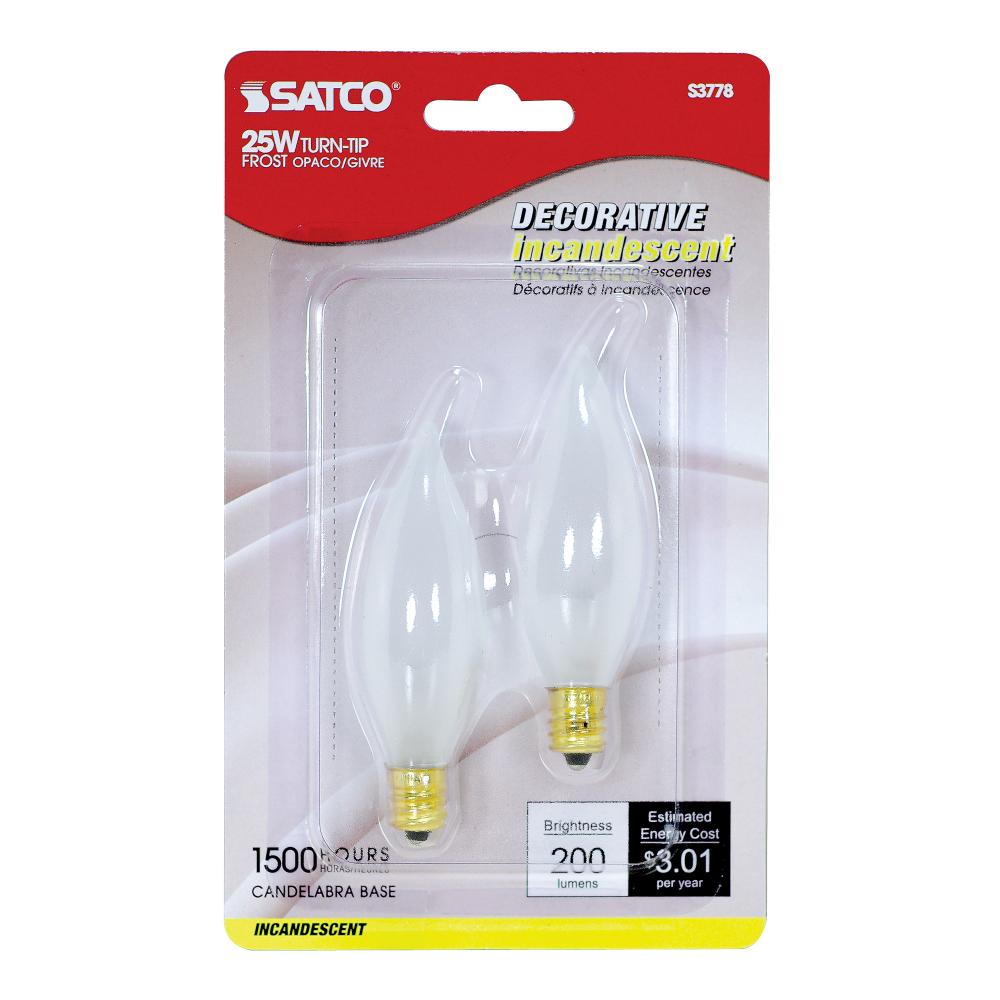 25 Watt CA8 Incandescent; Frost; 1500 Average rated hours; 200 Lumens; Candelabra base; 120 Volt;