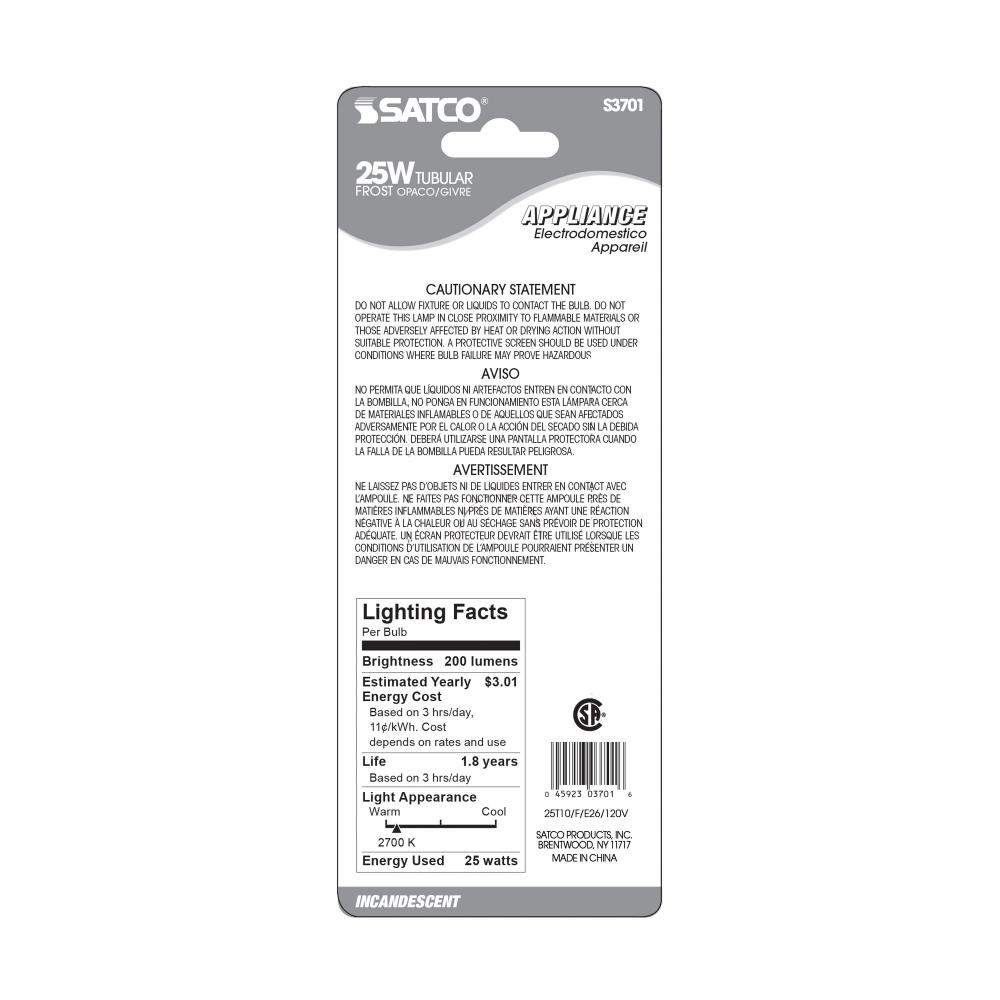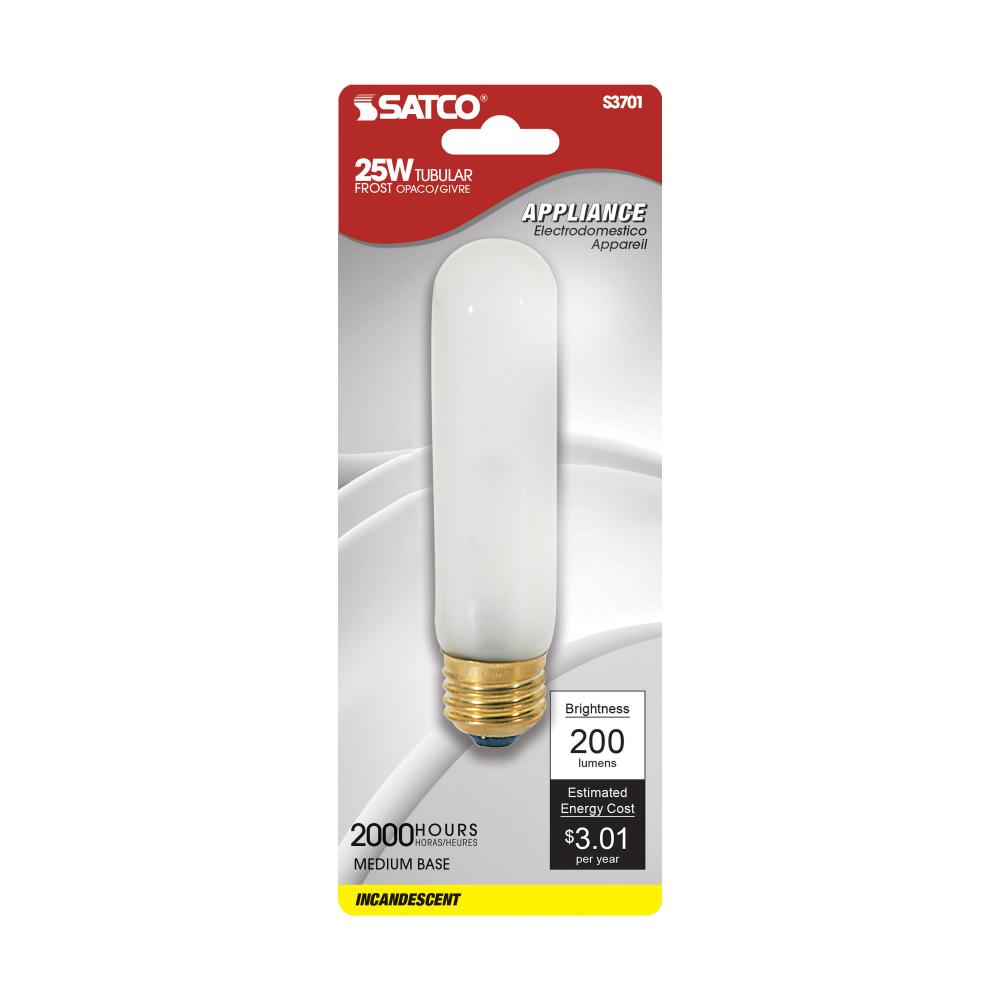 25 Watt T10 Incandescent; Frost; 2000 Average rated hours; 200 Lumens; Medium base; 120 Volt; Carded