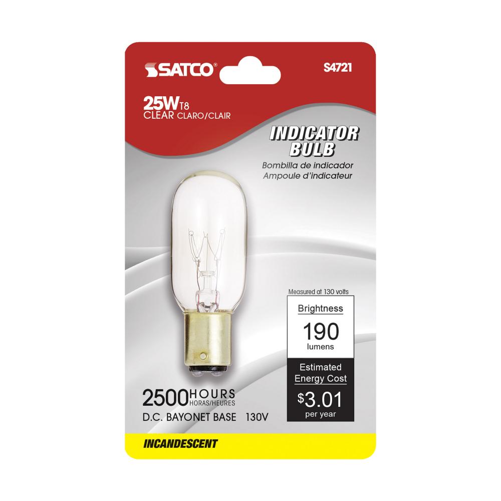 25 Watt T8 Incandescent; Clear; 2500 Average rated hours; 190 Lumens; DC Bay base; 130 Volt; Carded