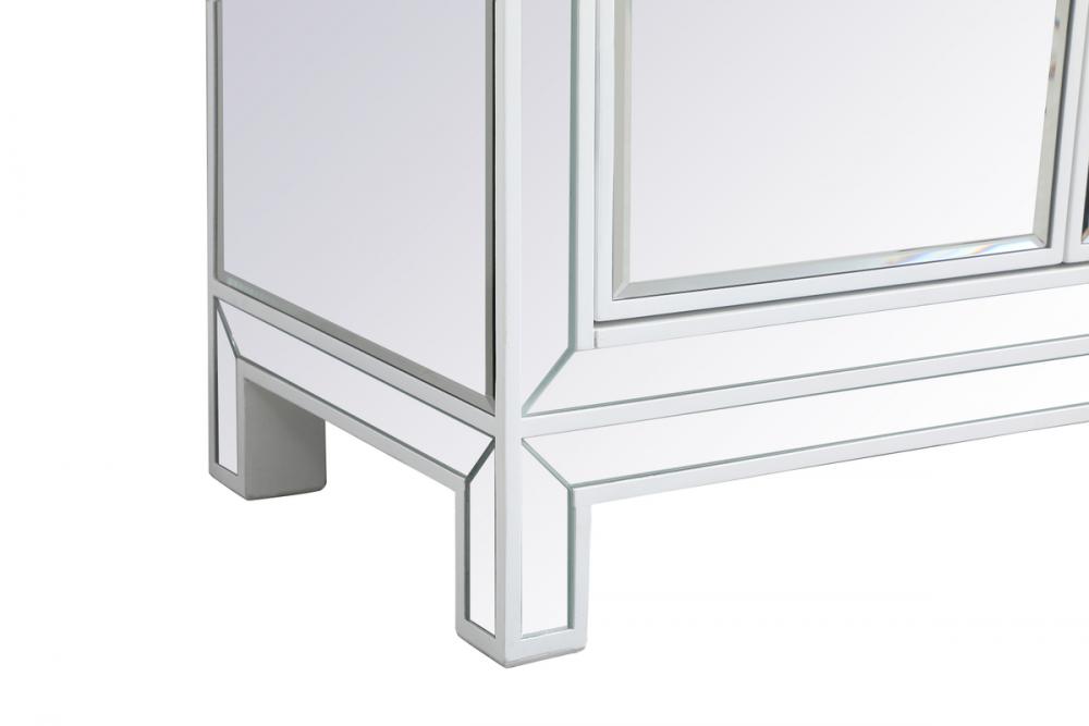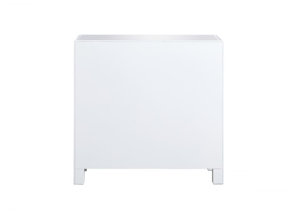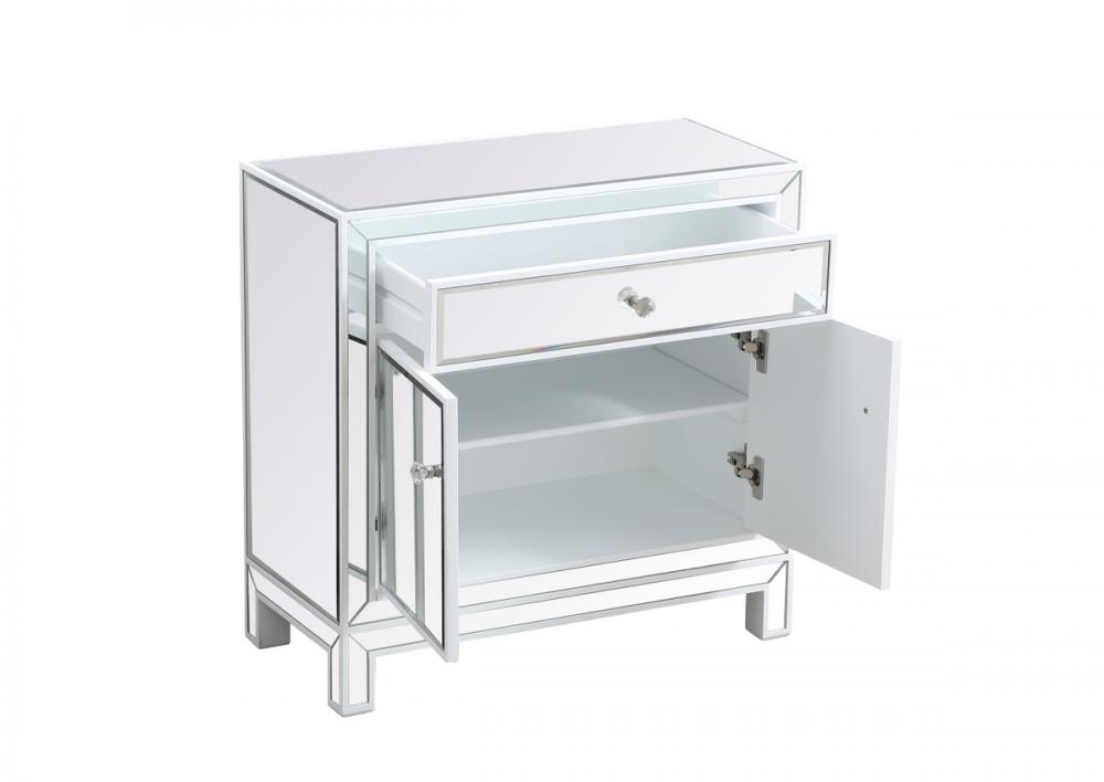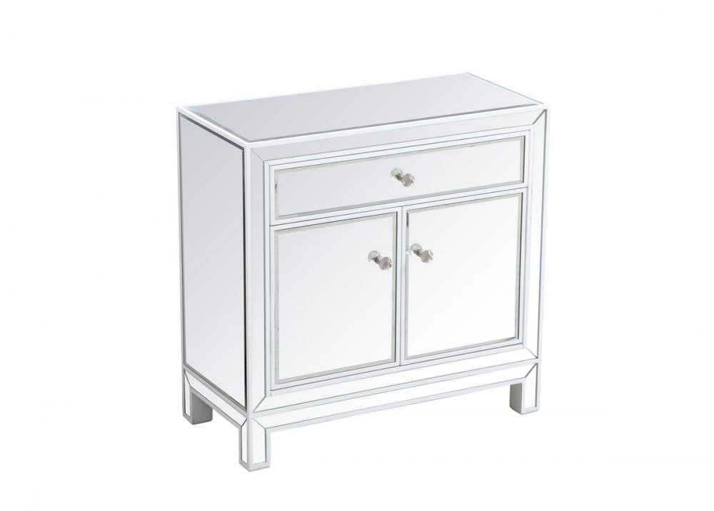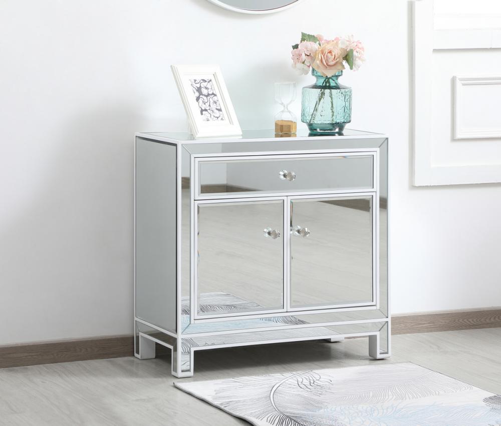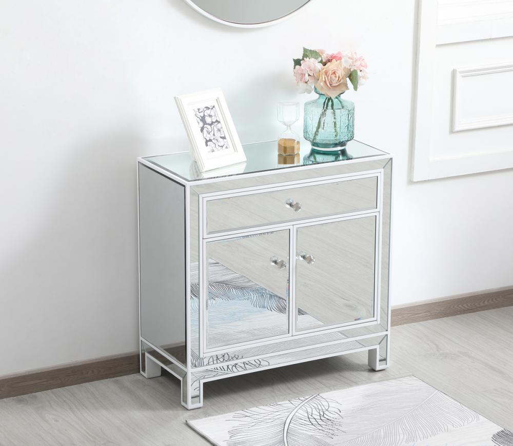 A perfect balance of contemporary style and practical utility, this chic one drawer, two doors mirror cabinet will enhance any room in your home. Featuring a hand painted finish, top quality mirror panels in distinctive mitered corner, jewel like crystal door knobs, it will provide you with stylish storage space you often need.