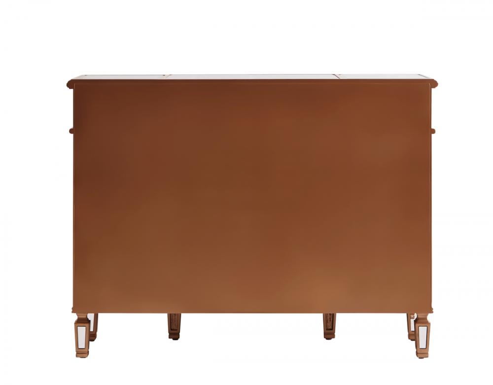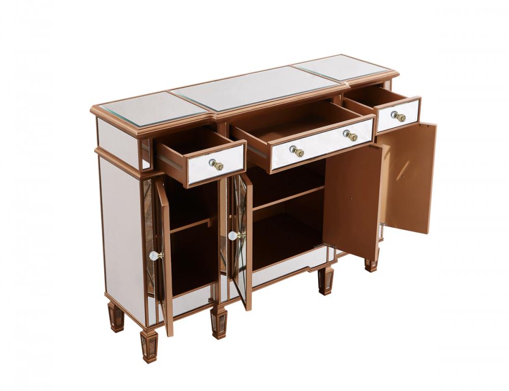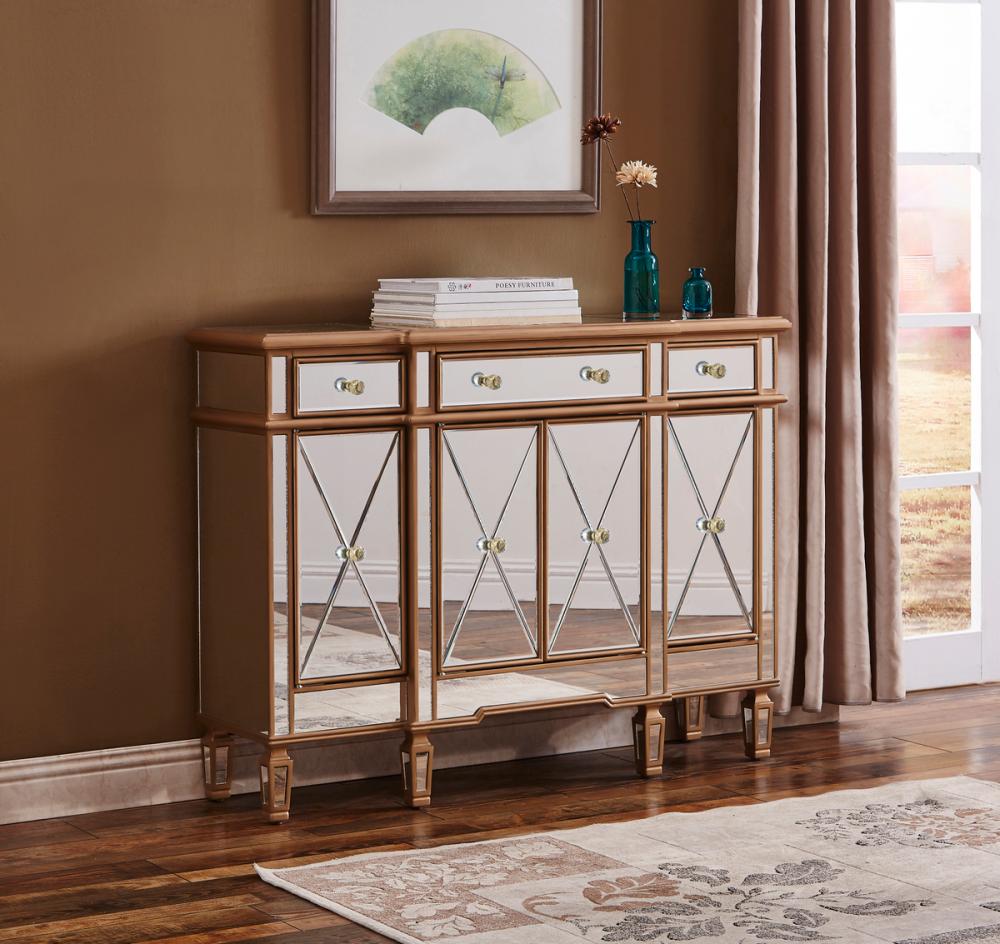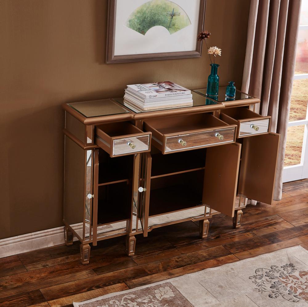 This fashionable, contemporary Mirrored console, with its hand-rubbed gold finish and incised carved, tapered legs, features a slight antique touch. Its 3 Mirrored drawers and 4 Mirrored door fronts are enhanced with brushed steel knobs. Measuring L48” x W14” x H36”, its alluring symmetry, size and shape make this piece perfect to magnify the beauty of your living room or add a touch of elegant decor to a hallway or narrow space. In addition, this attractive Mirrored cabinet offers you extra storage space and a wide display area for your art objects, figurines or candle holders. (Constructed with selected kiln-dried solid wood and engineered wood panels.)