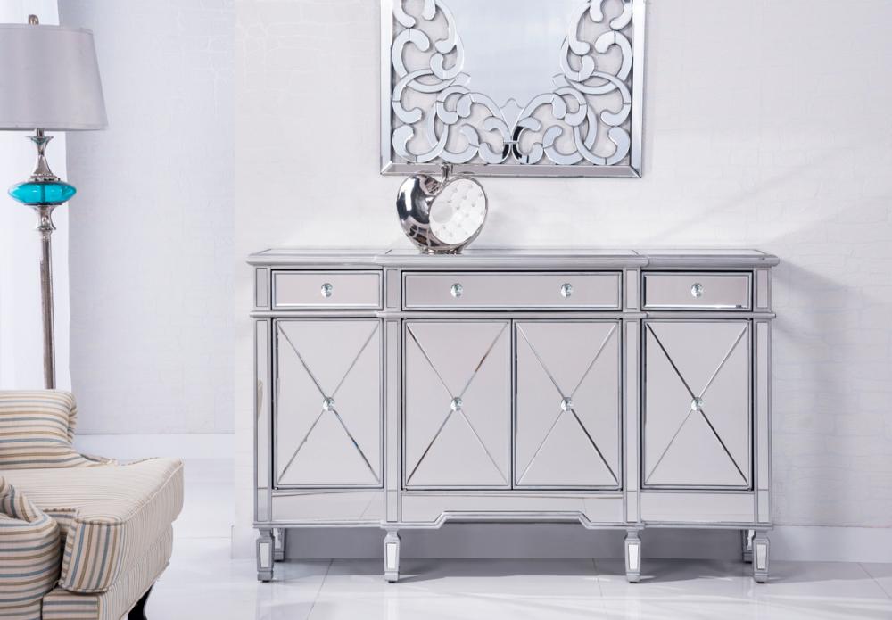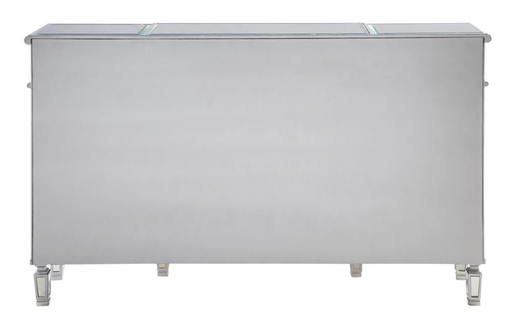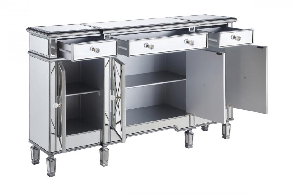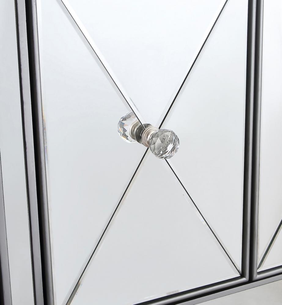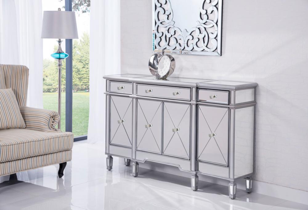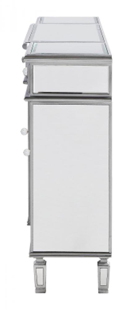 This fashionable, contemporary mirrored console, with its hand-rubbed silver finish and incised carved, tapered legs, features a slight antique touch. Its 3 mirrored drawers and 4 mirrored door fronts are enhanced with brushed steel knobs. Measuring L60” x W14” x H36”, its alluring symmetry, size and shape make this piece perfect to magnify the beauty of your living room or add a touch of elegant decor to a hallway or narrow space. In addition, this attractive mirrored cabinet offers you extra storage space and a wide display area for your art objects, figurines or candle holders. (Constructed with selected kiln-dried solid wood and engineered wood panels.)