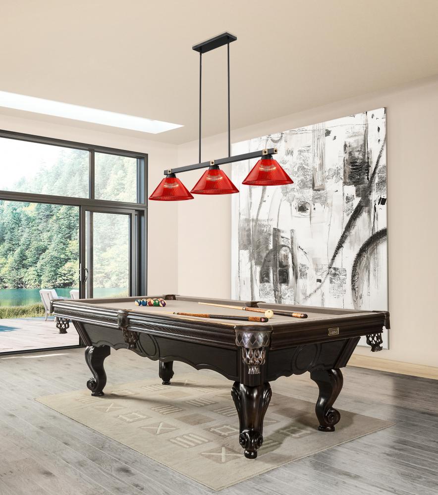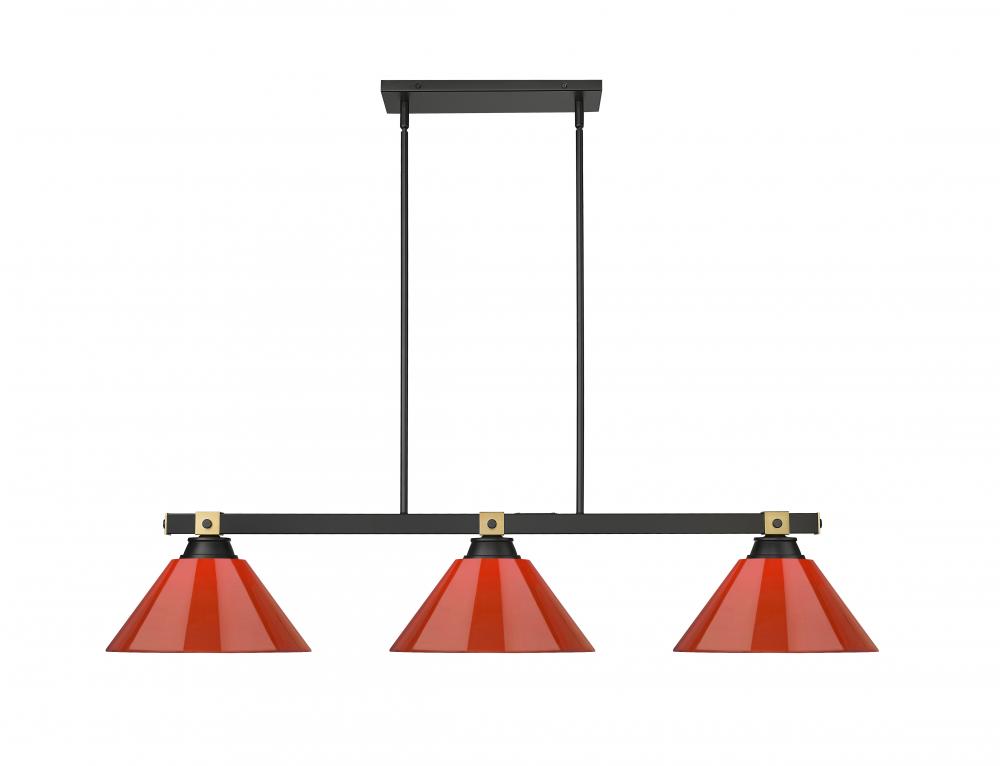 Bright red shades bring eye-catching style and personality to this modern three-light billiards pendant. Offering a linear silhouette perfect for game and dining tables, the pendant features a streamlined structure with a matte black finish and rubbed brass accents that add the perfect touch of richness.