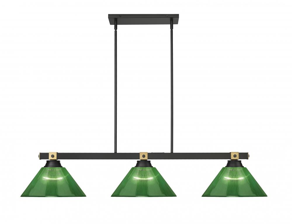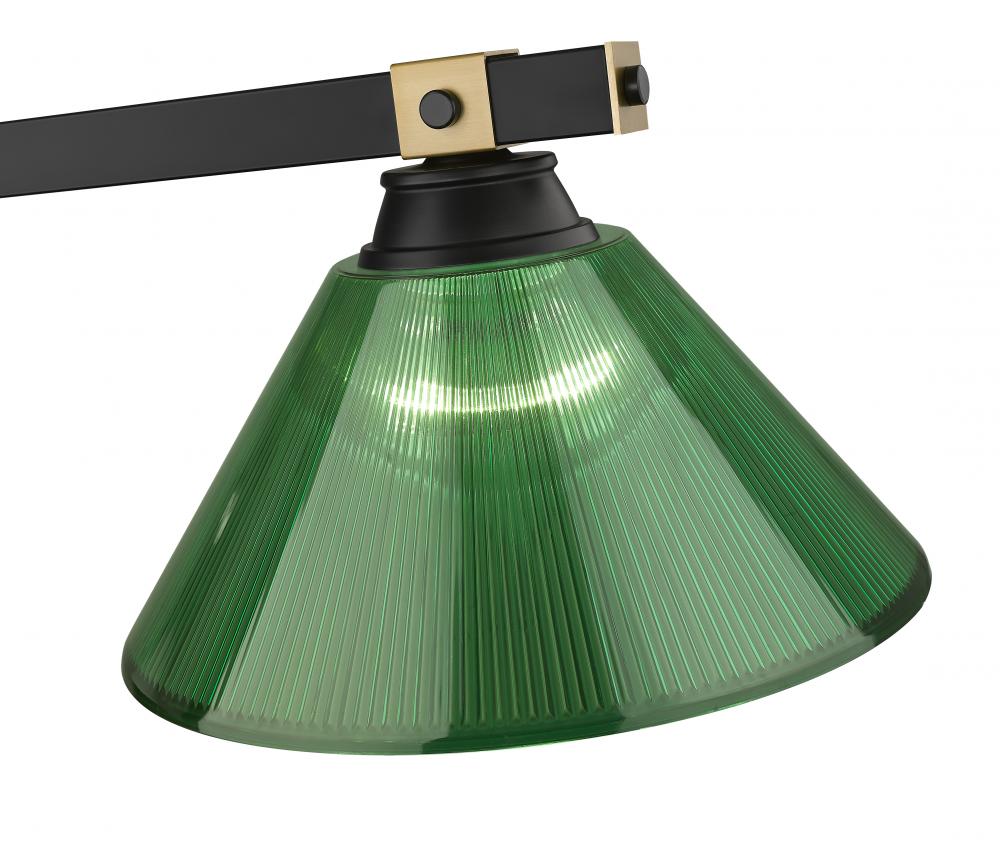 Instill a little color and personality into your dining room or gaming space with this modern three-light billiards pendant. Its green shades add richness and depth, perfectly accentuating its matte black finish and rubbed brass accents. Its clean lines and linear structure offer a versatile style, perfect for gaming spaces, dining rooms and conference tables.