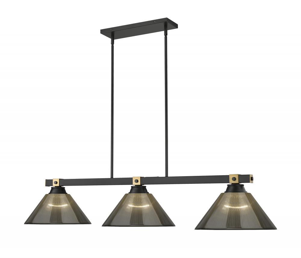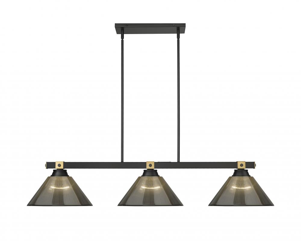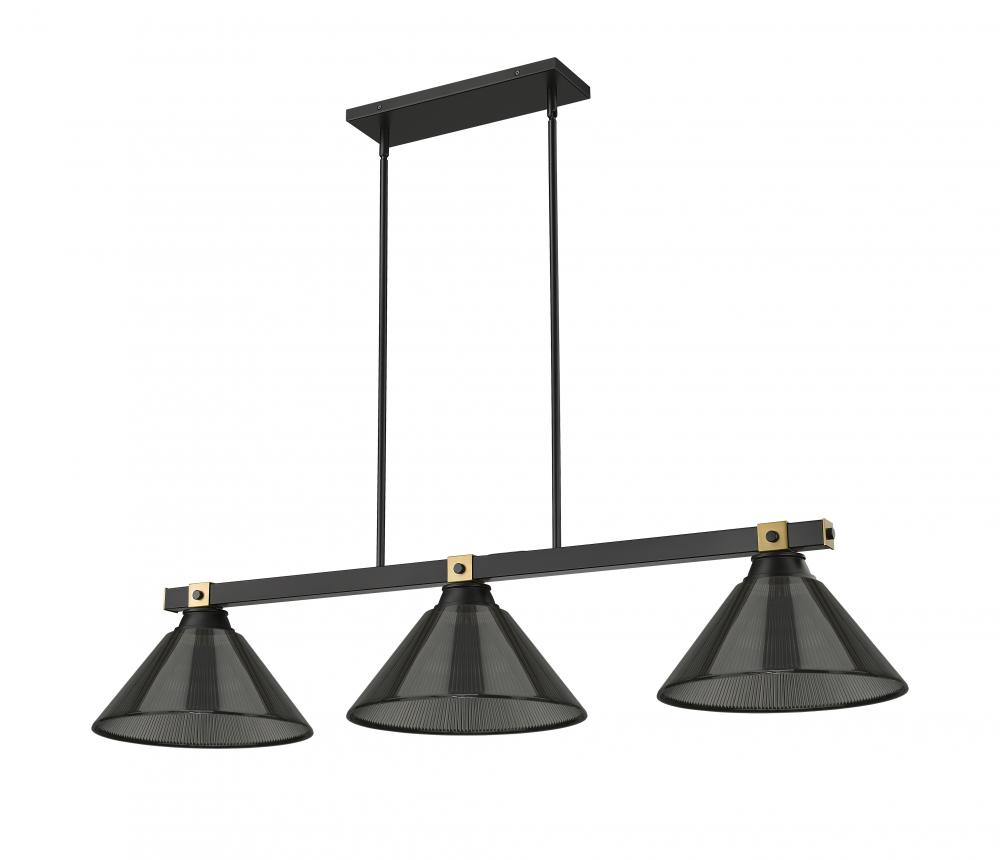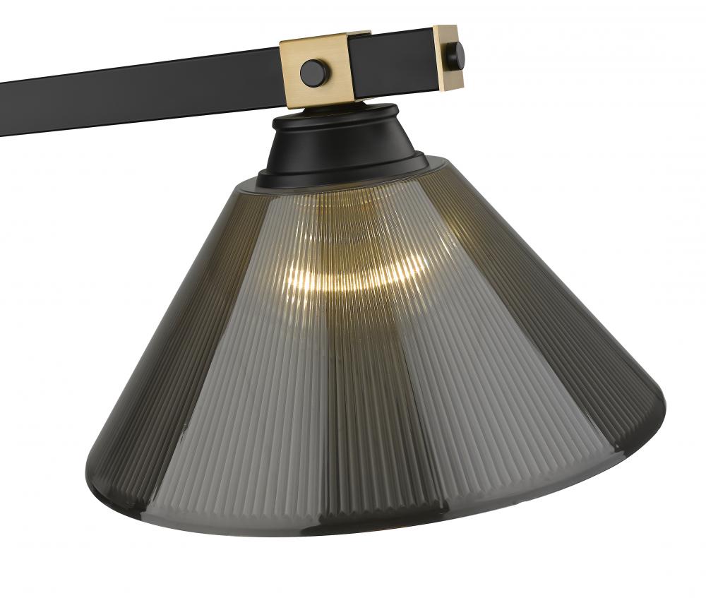 Smoky conical shades create a hint of mystery for this modern three-light billiards pendant. Its clean-lined structure adds linear appeal, perfect for a pool table or dining room. A matte black finish completes the look with hints of rubbed brass, delivering just the right touch of warmth and sophistication.