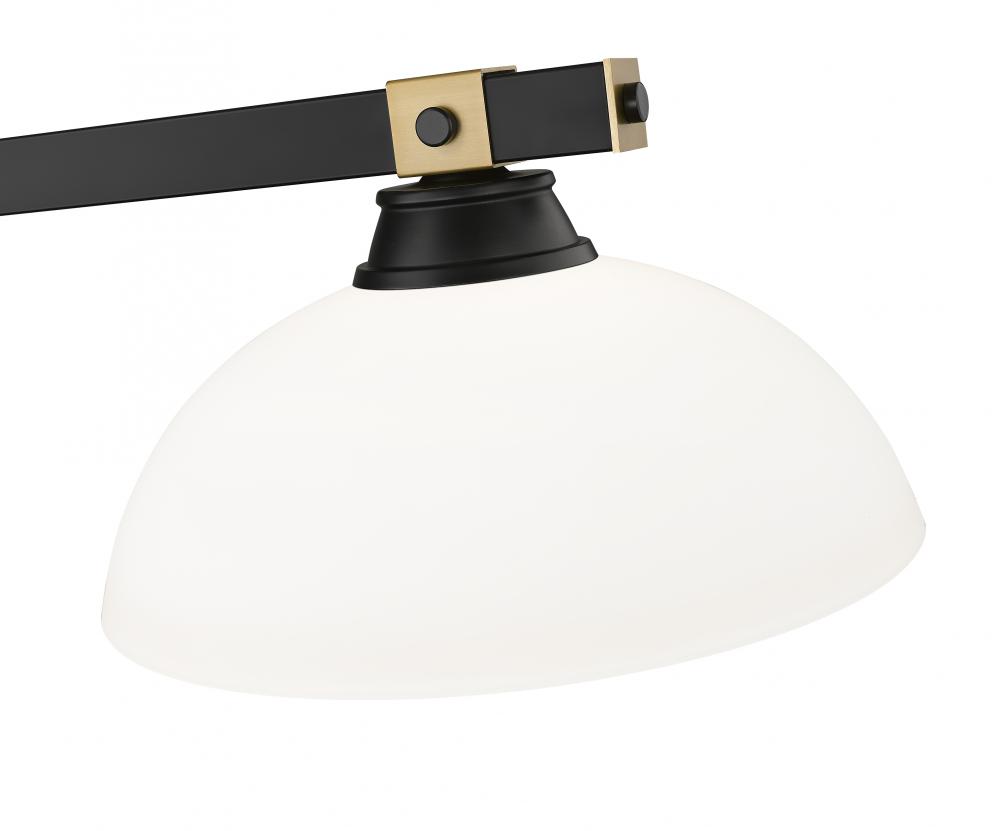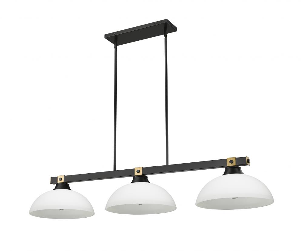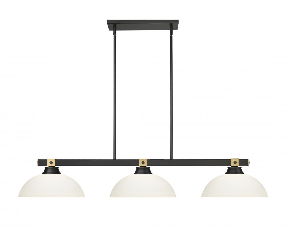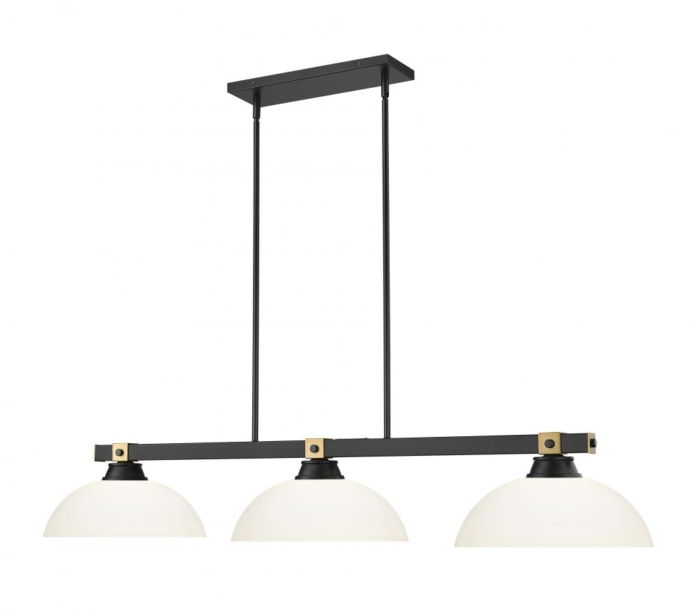 Stylish white domed shades provide excellent illumination from this modern three-light billiards pendant. Perfect over a game table or in your dining room, it delivers a linear silhouette with bright, true lighting for every occasion. A matte black finish and rubbed brass embellishments are a stylish and versatile combination to suit any space.