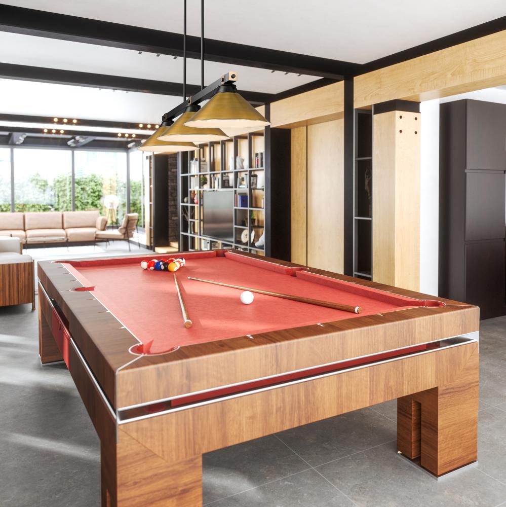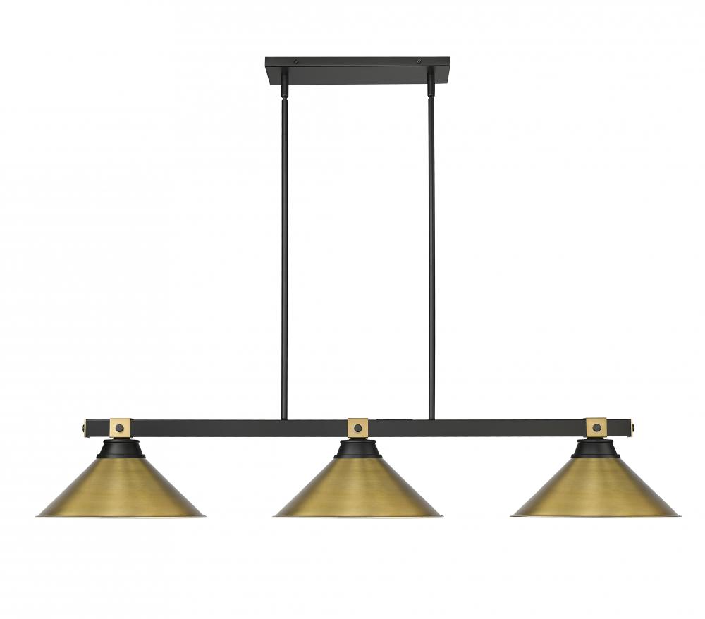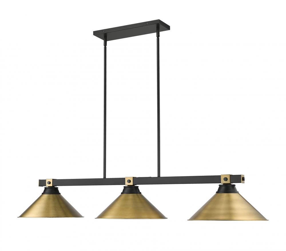 Golden shades bring warmth and sophistication to the streamlined structure of this modern three-light billiards pendant. Beautiful in a refined dining room or gaming space, the linear fixture offers stylish presence with rubbed brass embellishments. Shades feature a white interior for bright lighting, perfect for games or dining.