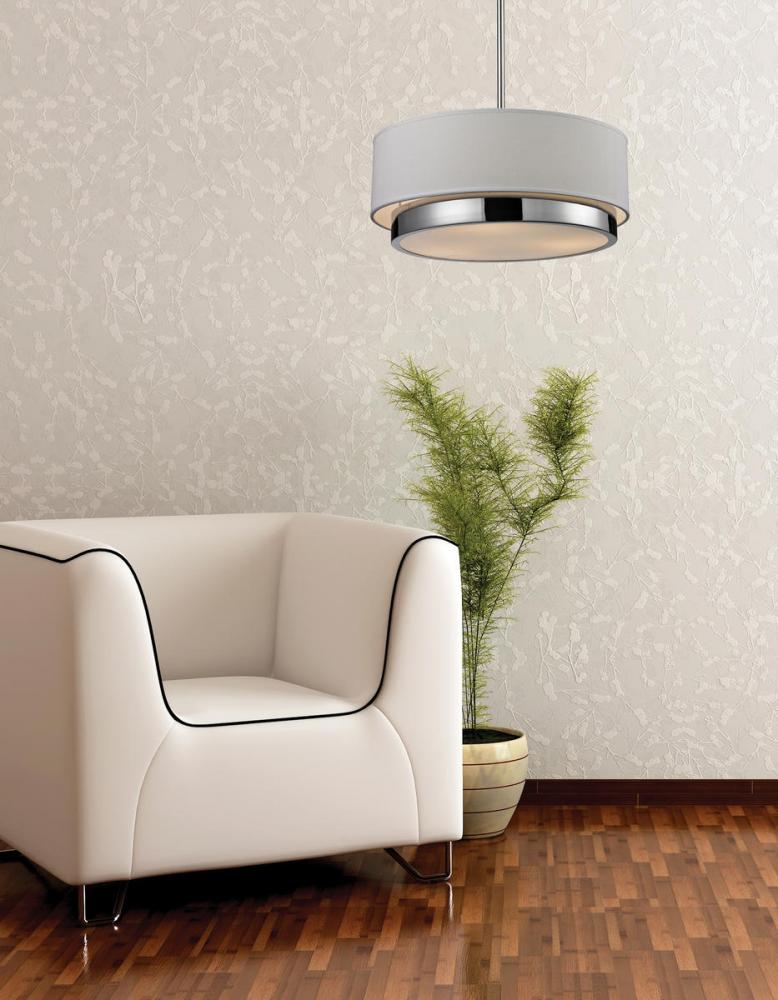 A white linen cylindrical drum shade defines this elegant pendant, as does its complimentary chrome hardware. This fixture is sure to add contemporary class to any space.