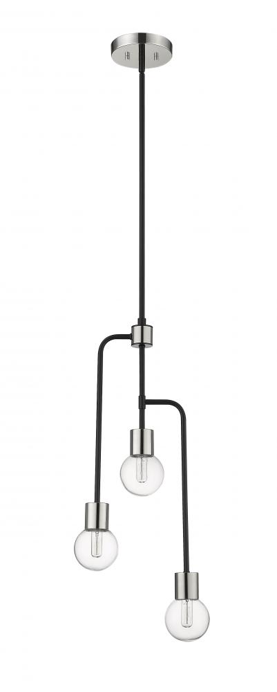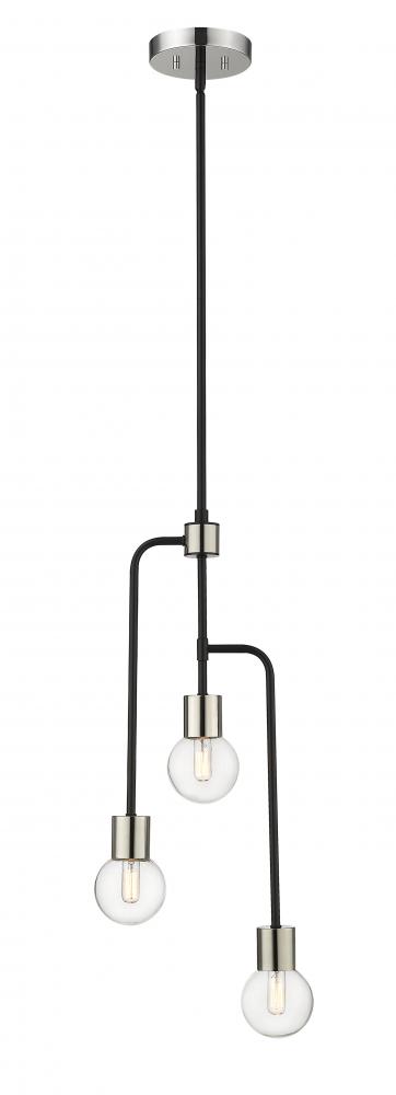 With an elegant and stunning tiered design, this contemporary chandelier from the Neutra collection lends a vintage-inspired, mid-century modern vibe. With three clear globe-shaped pendants casting a bright light throughout, this chandelier is hung by a stepped matte black drop rod with shiny polished nickel accents. This steel three-armed chandelier also makes the perfect addition as a focal piece hung within an Art-Deco inspired home.