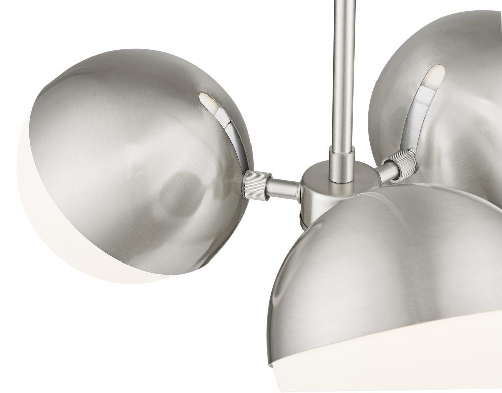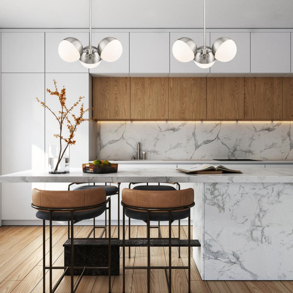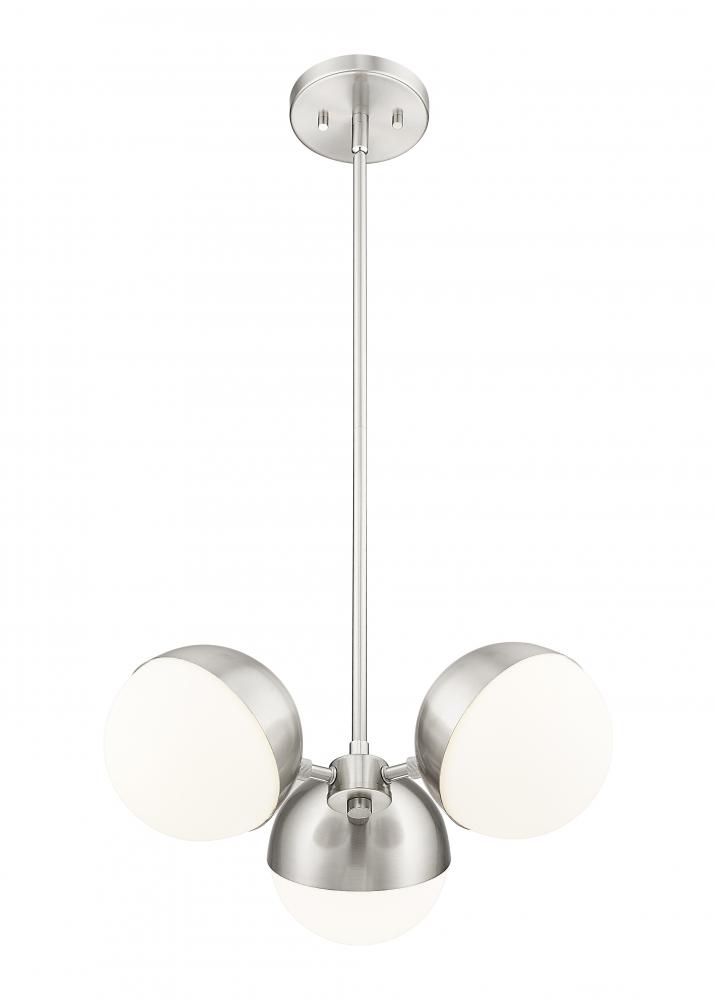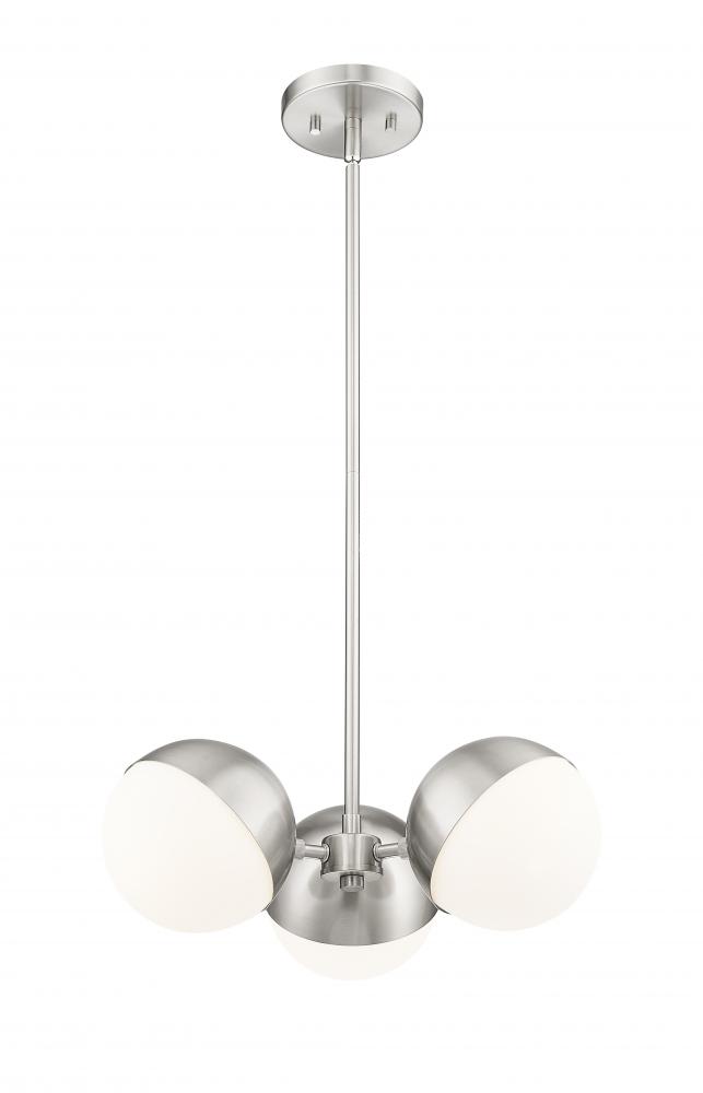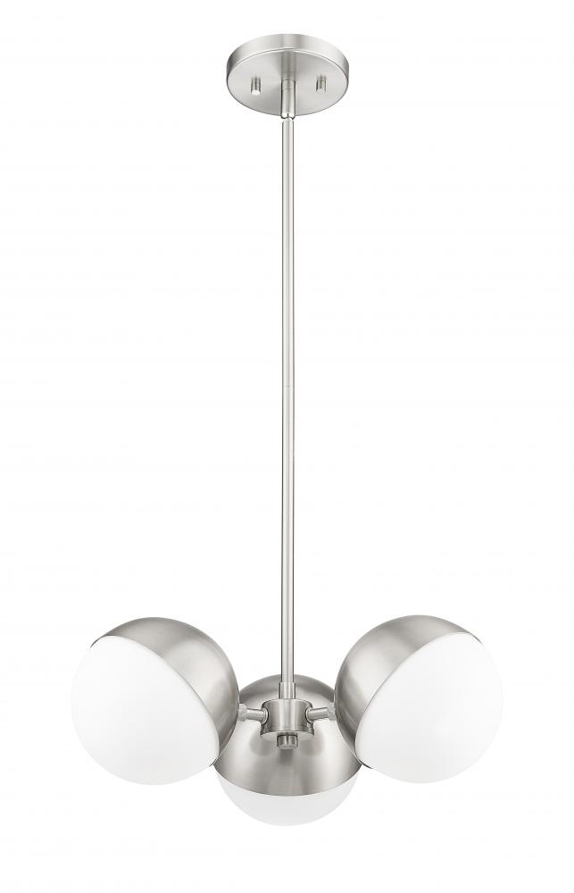 Cast multi-directional illumination with a modern three-light chandelier with mid-century inspired charm. It features three globe lights, complete with moveable metal shields that allow a custom look and feel in any space. Orbs of opal glass pair with a chic brushed nickel finish for an understated ambiance in your home.