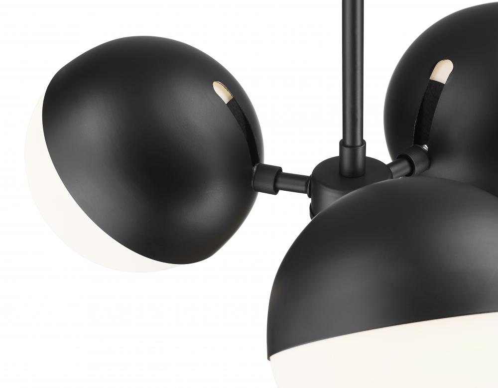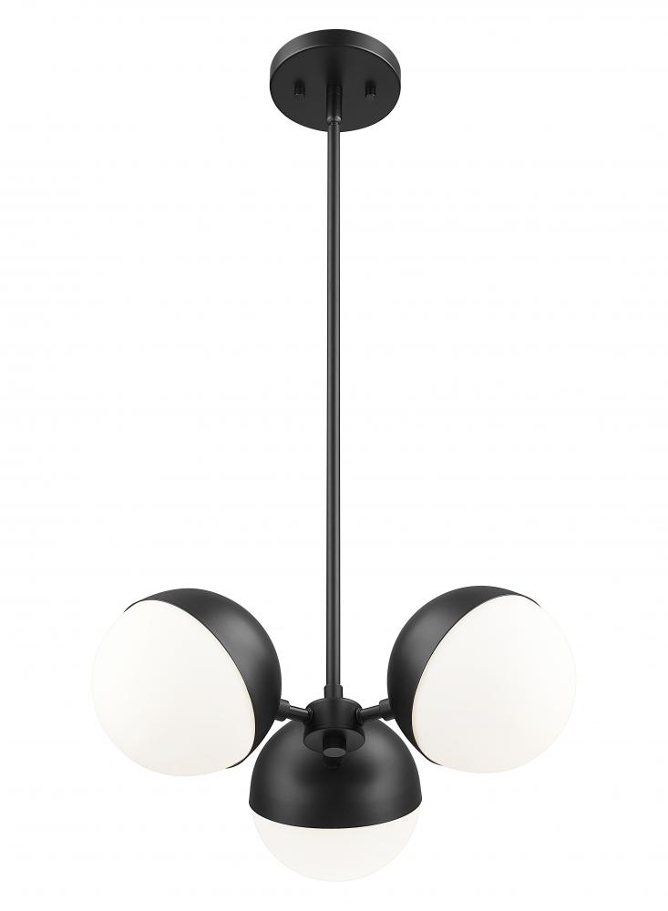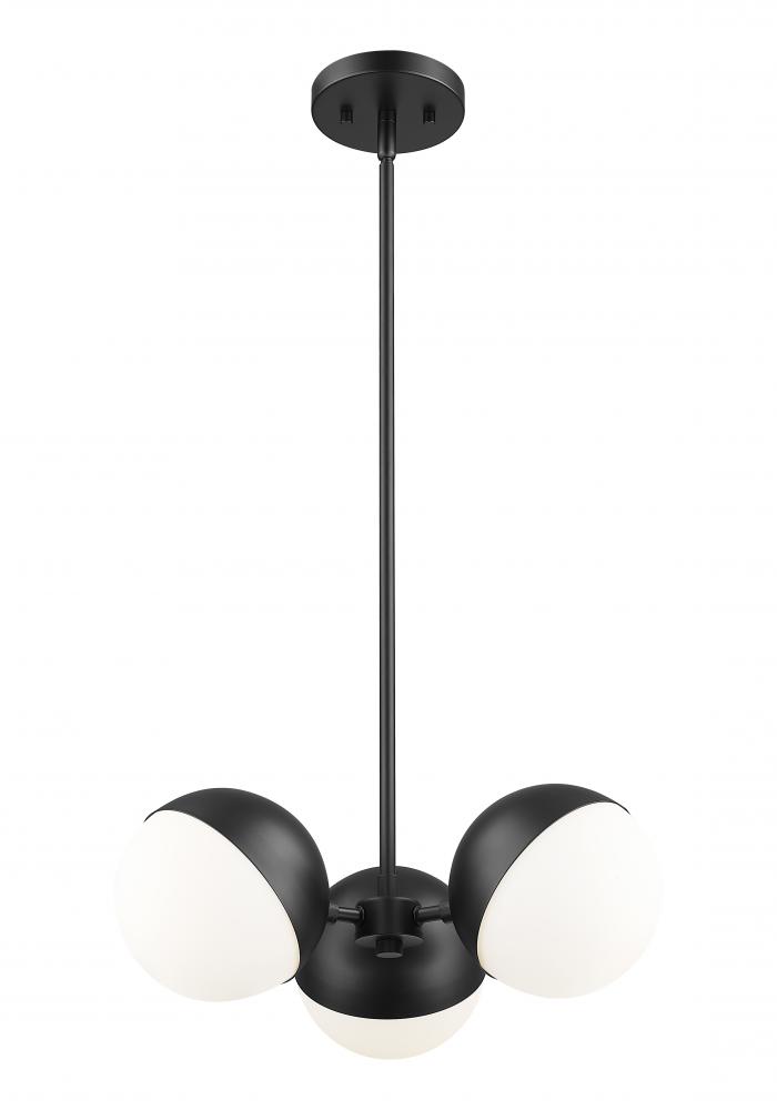 Create depth and contrast with the matte black finish featured on this modern three-light chandelier. Designed to make a statement while delivering multi-directional lighting, its a whimsical cluster of three orb lights, each with a matte opal glass ball shade that softly diffuses lighting for excellent ambiance.