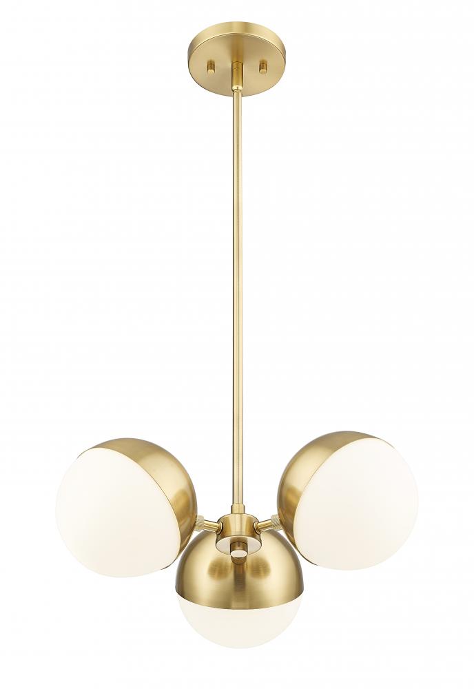 The rich warmth of a modern gold finish highlights this mid-century inspired three-light chandelier. Its vintage character brings eye-catching style, while three orb lights cast multi-directional illumination, perfect for a breakfast nook or cozy seating group. The chandelier features orb shades, each with opal glass and a moveable metal shield that allows for a custom look and precision illumination.