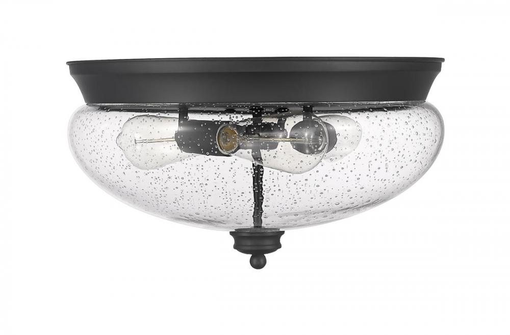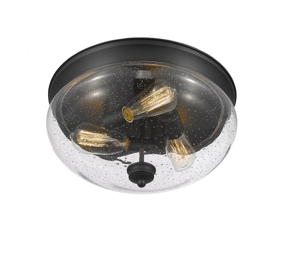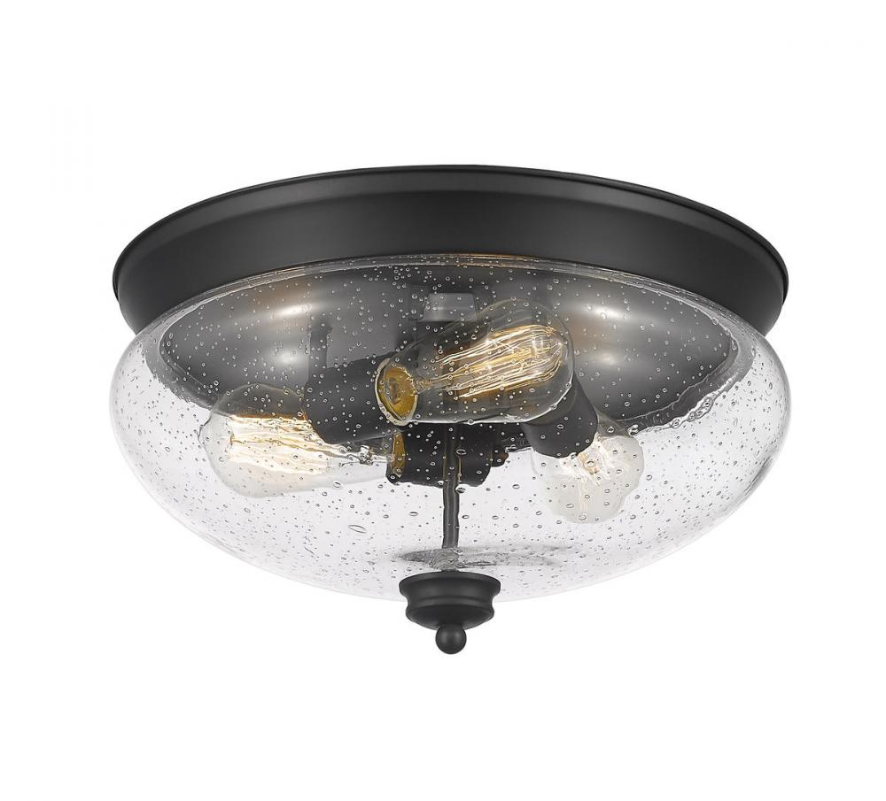 Building on an iconic schoolhouse theme, this three-light flush mount ceiling light offers a stylish source of illumination for a transitional space. Presenting a gorgeous contrast, its Matte Black finish metal accents make a Seedy Glass dome shade appeal to the mysterious at heart.