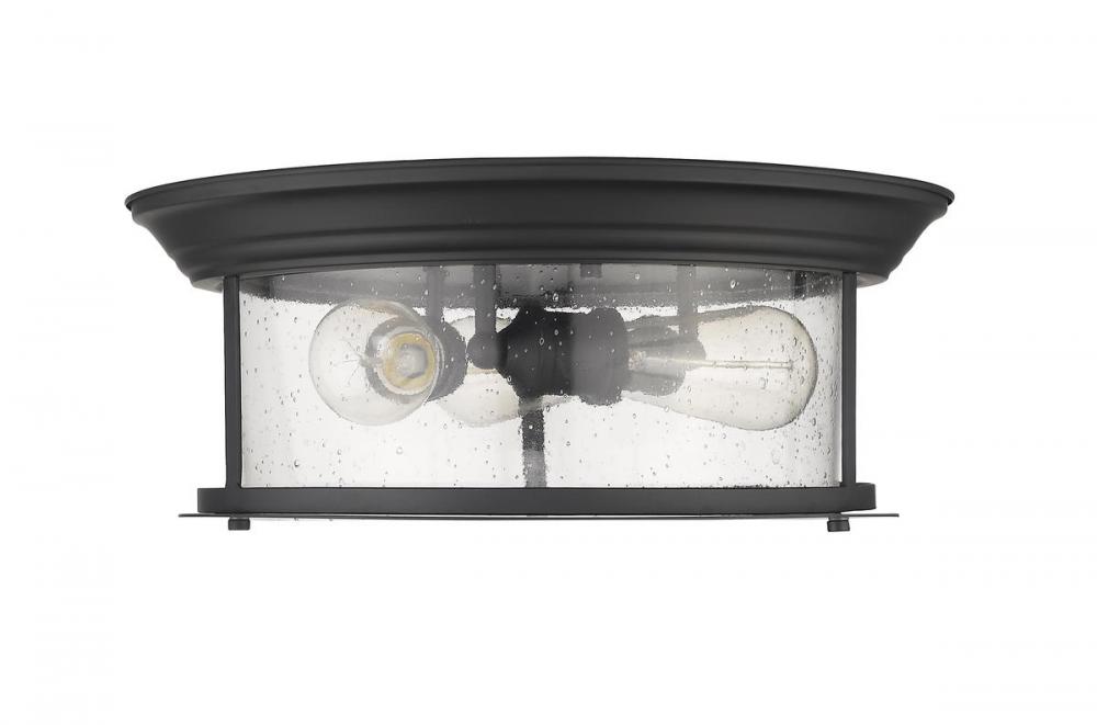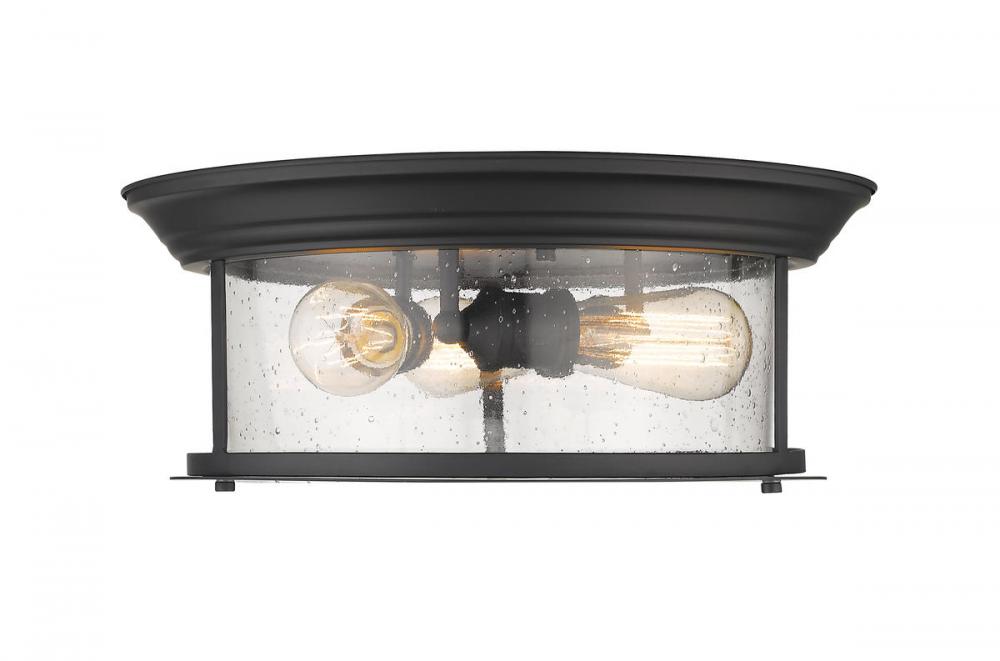Cool industrial ambiance offers a stylish look to transitional spaces in need of functional, fashionable fixtures. With bold Matte Black finish metal providing a circular cage-like frame and a wide cylindrical clear seedy glass shade completing its visual package, this three-light flush mount ceiling light becomes an integral part of an overall design scheme as it delivers ambient lighting.
