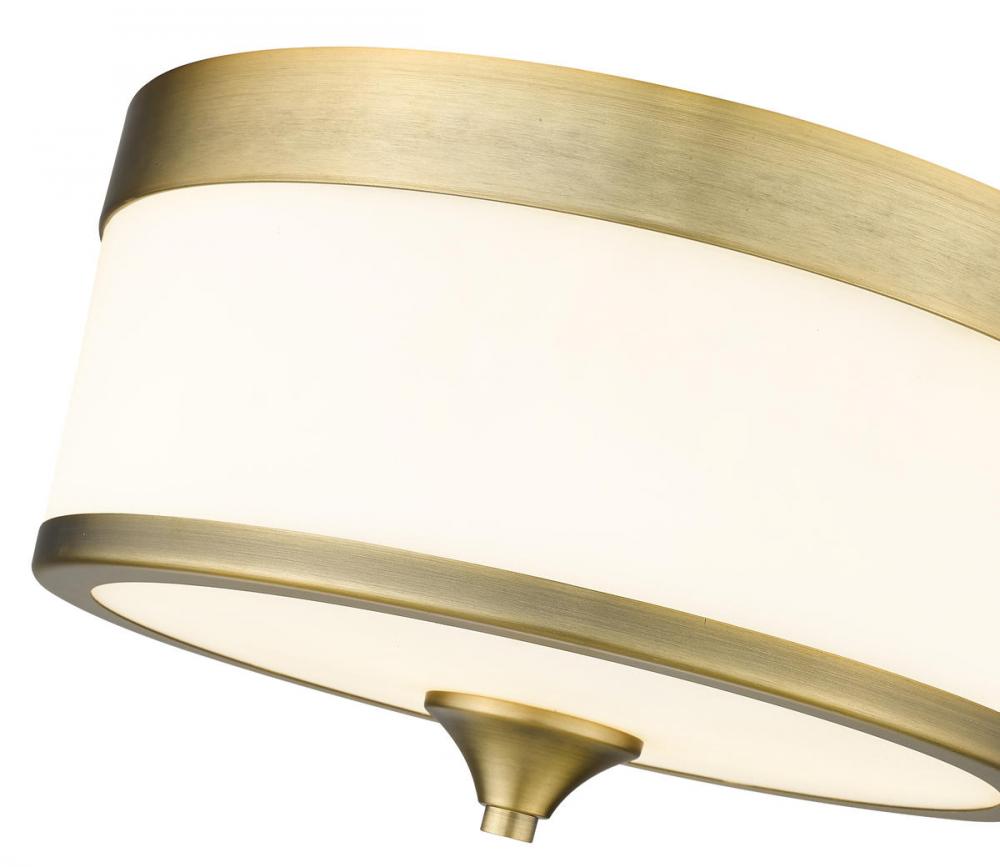 This stylish modern three-light flushmount ceiling light from the Cosmopolitan collection offers a touch of Art Deco flavor, adding simplicity with a twist to a kitchen, dining space, or bedroom. An etched milk white shade is trimmed with heritage brass finish steel bands, creating a slick geometric effect.