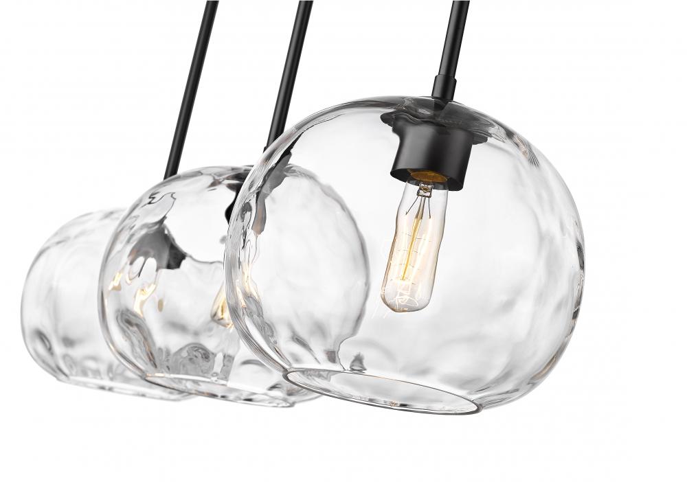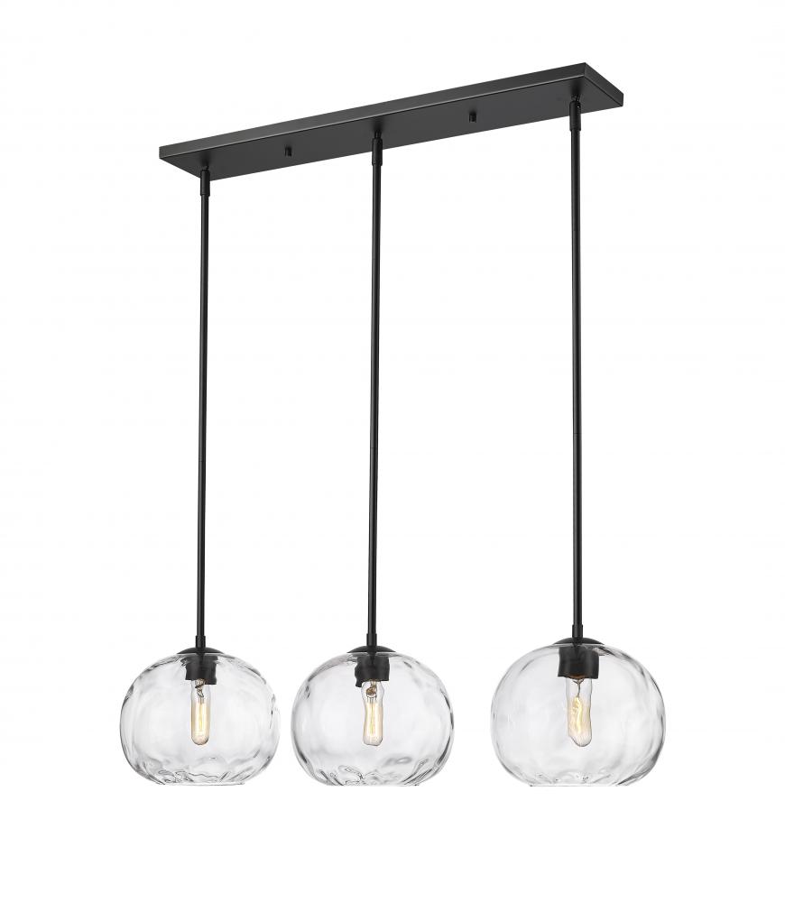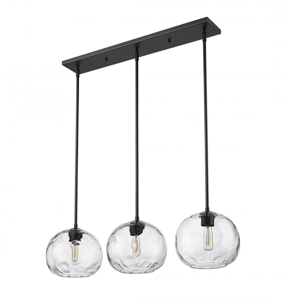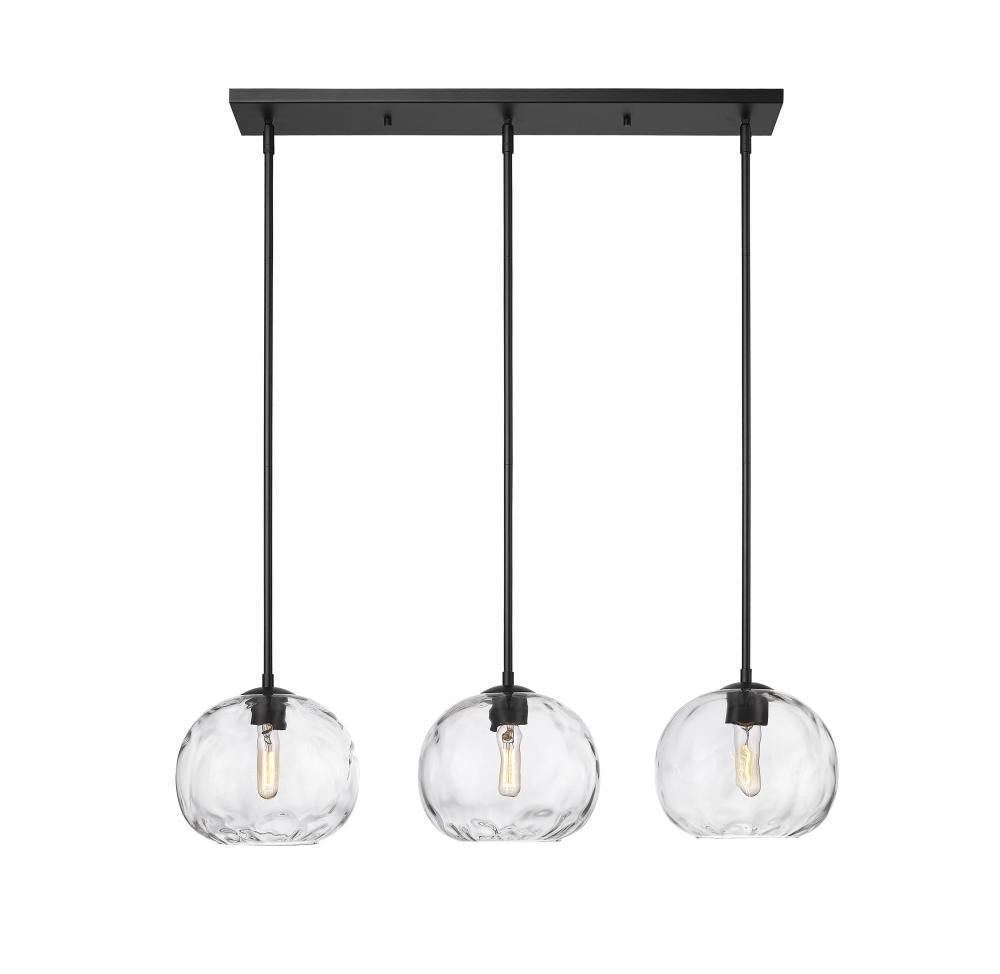 Define your modern space with the eye-catching, streamlined presence of this linear style three-light chandelier. Rounded shades are made from clear, water-textured glass, suspended from a sleek steel frame with a matte black finish. Your contemporary dining room or family space gets an instant boost with this sophisticated fixture.