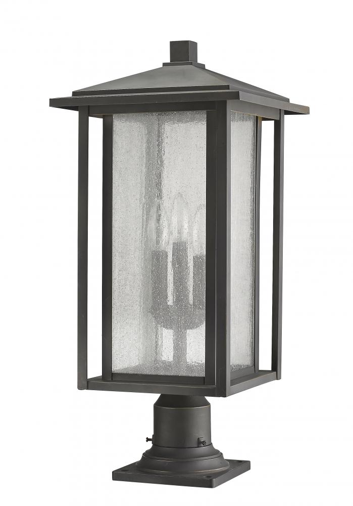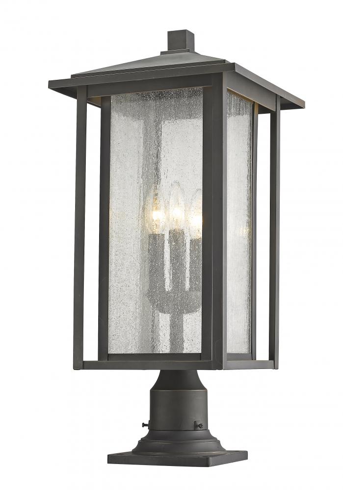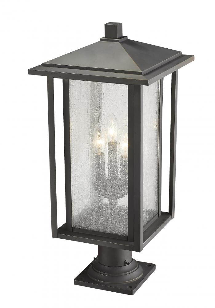Enjoy a lush oil rubbed bronze finish that adds a warm update to the craftsman look of this three-light outdoor pier mounted fixture. Light up an exterior space in style with a durable aluminium dual frame that houses a romantic, texture-inspired seedy glass shade and a candelabra style bulb base.