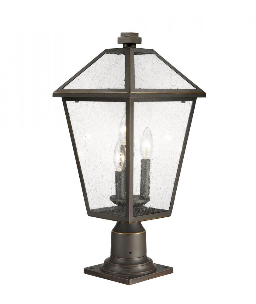 Illuminate an exterior front or back walkway with a classic fixture reflecting a charming village theme. Made from Rubbed Bronze metal and seedy glass panels, this three-light outdoor pier mounted fixture delivers a charming upgrade with industrial-inspired attitude and a silhouette thats perfect for lower-level gardens and walkways.