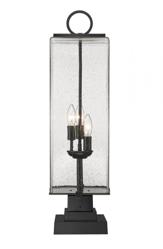 Stylishly provide coastal allure to your patio or deck with this three-light outdoor pier mounted fixture. Crafted of steel, this fixture features a black finish and a seedy glass shade for added style.