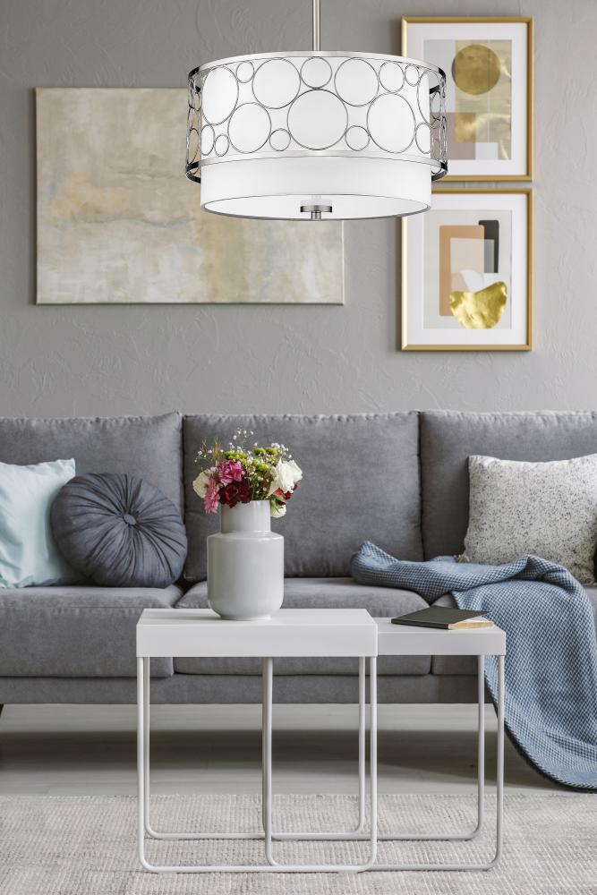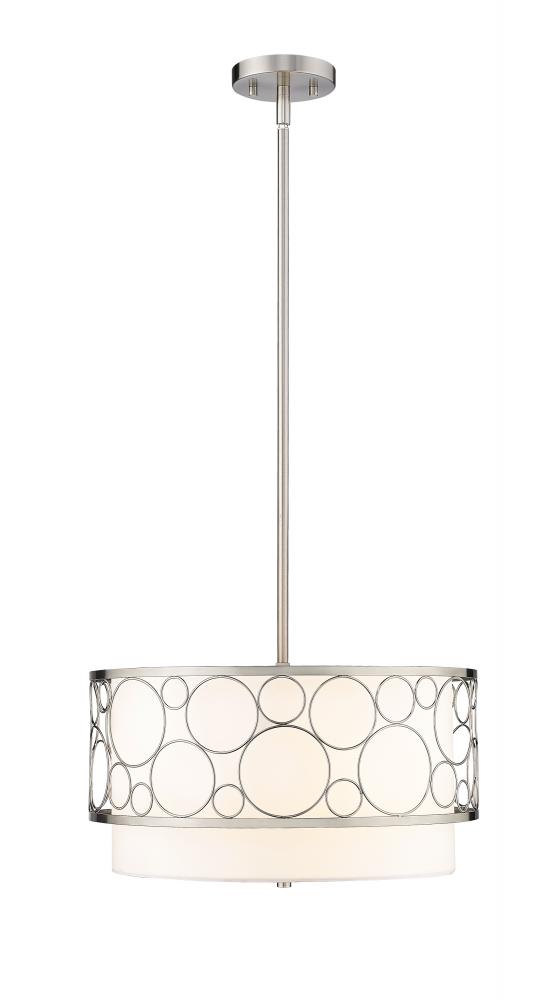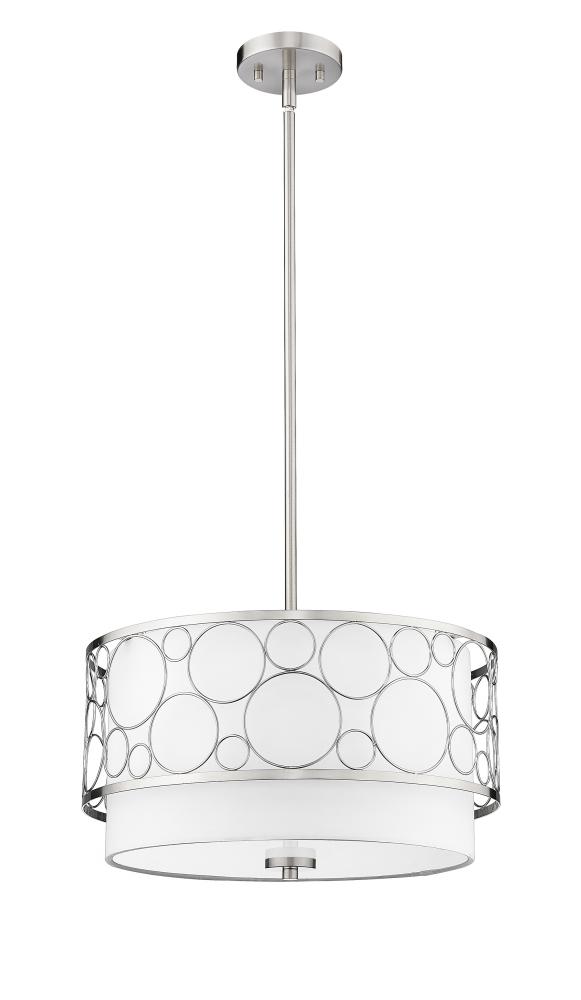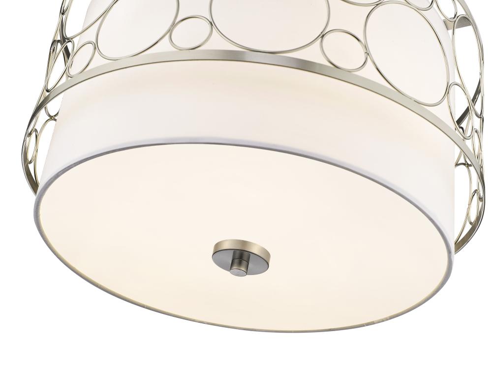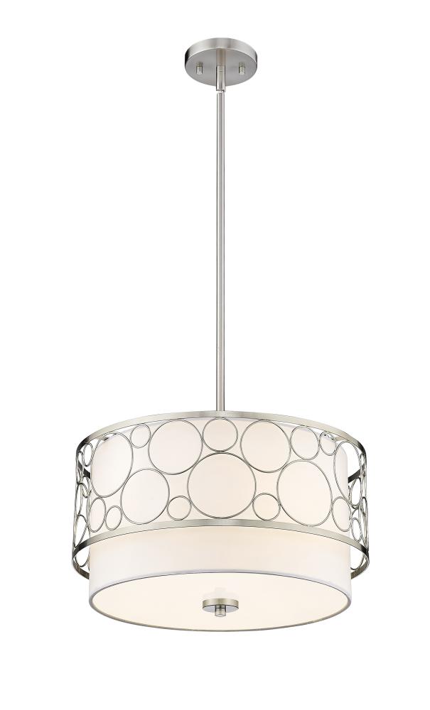 Create a breathtaking contemporary aesthetic within a space with this transitional three-light pendant. A soothing glow emitted from inside a beautiful white linen drum shade as a brushed nickel finish cage offers a champagne bubble-inspired, geometric motif that catches the eye.