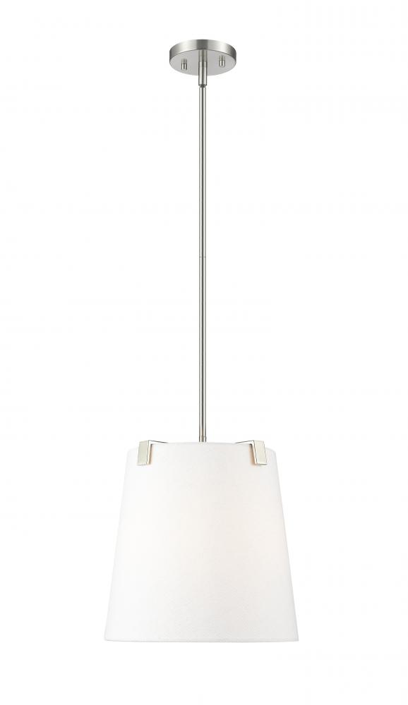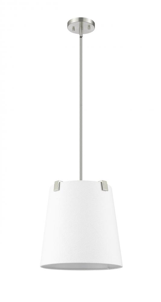 Indulge in a modernized version of traditional lighting with a three-light pendant delivering graceful and fluid design elements. Brushed nickel finish steel framing with clips attaches to a bright white linen fabric shade, offering low-profile elegance, as candelabra lights diffuse illumination beautifully. This fixture is dimmable, creating mood lighting and efficient functionality.