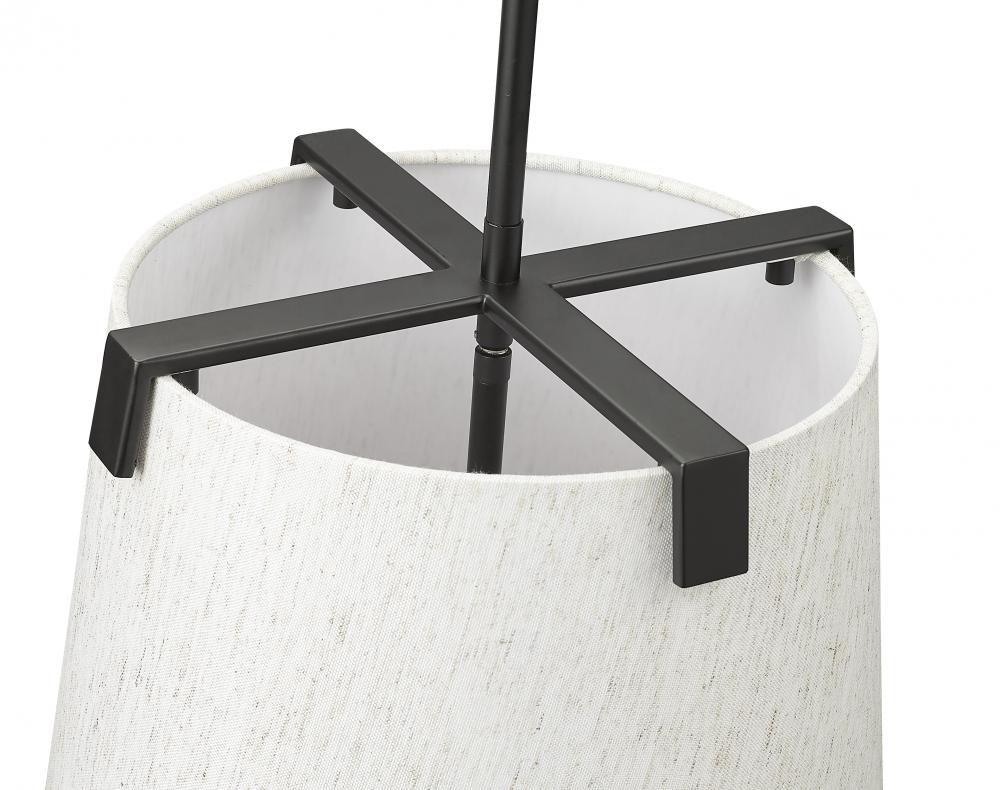 Make a statement in a modern or transitional space with a classic design in fixtures. This three-light pendant highlights islands or living spaces with a sophisticated look, blending bold matte black finish steel framing and accent clips to a cream fabric shade, as candelabra lights filter through the diffused shade. This dimmable fixture offers variable lighting levels to suit different spaces.