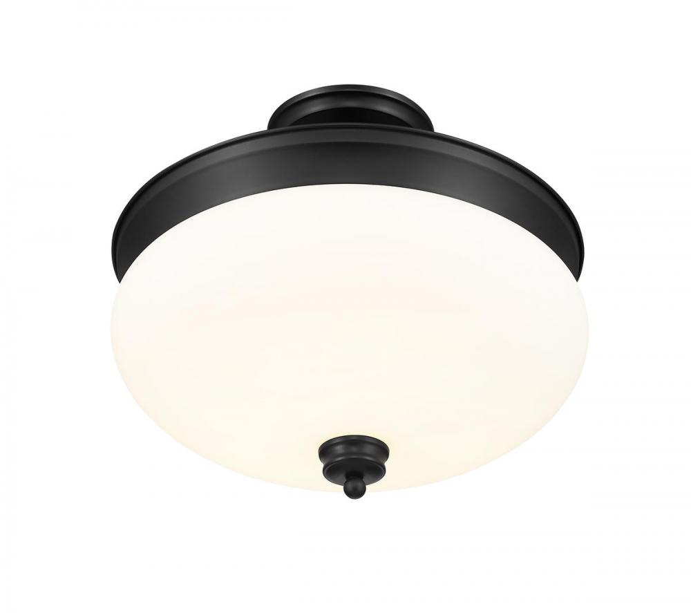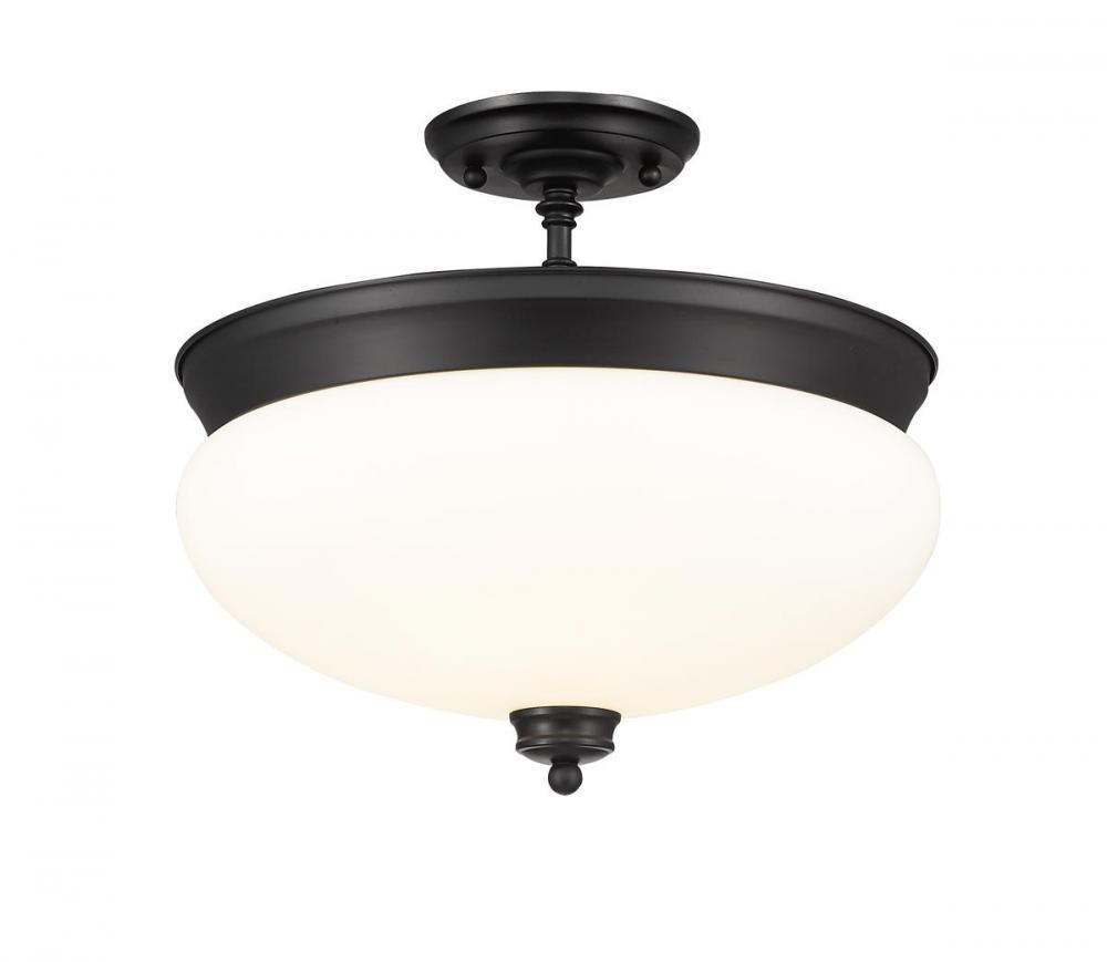 Building on an iconic schoolhouse theme, this three-light semi-flush mount ceiling light offers a stylish source of illumination for a transitional space. Presenting a gorgeous contrast and ornate detailing, its Matte Black finish metal accents make a Matte Opal dome shade appeal to the romantic at heart.