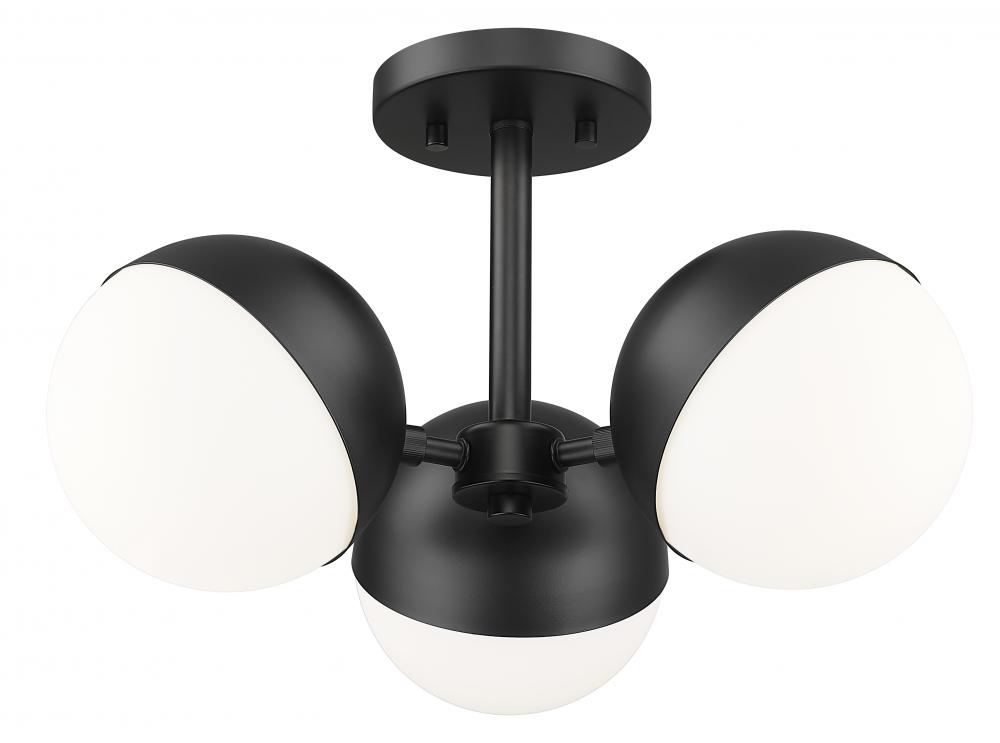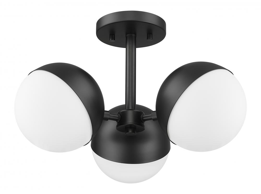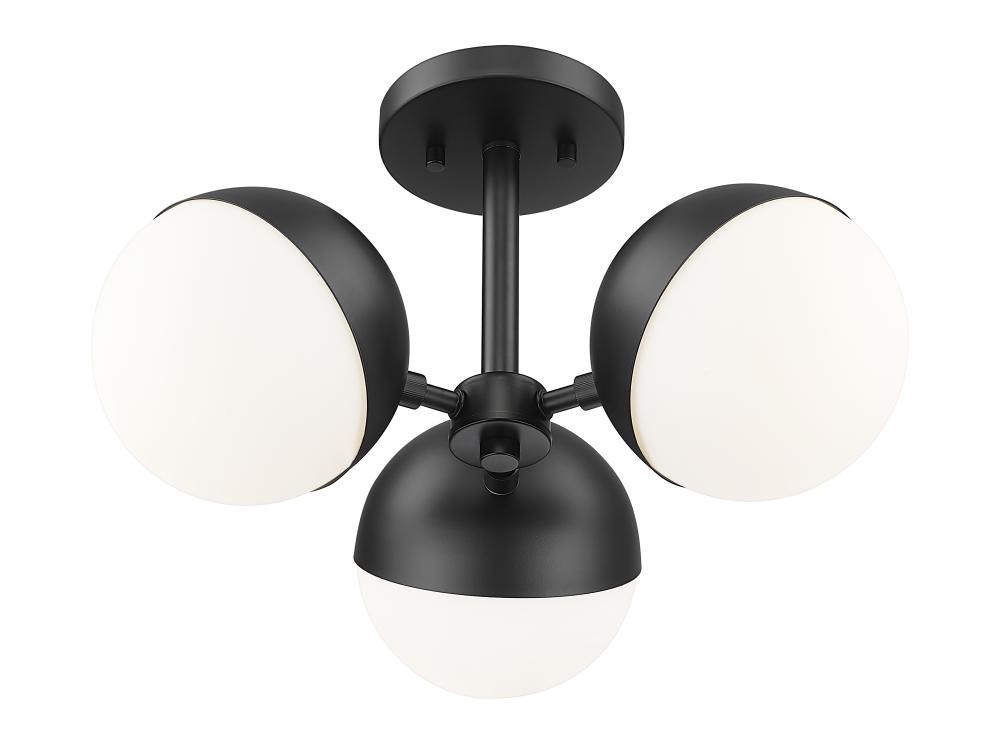 A modern three-light semi-flushmount ceiling light sets a refined, elevated tone in your bedroom or home office. It casts soft, inviting illumination with three opal glass orb shades, each paired with a moveable shield that allows you to your customize its look. The fixture receives a matte black finish, offering optimal contrast and depth to your charming space.