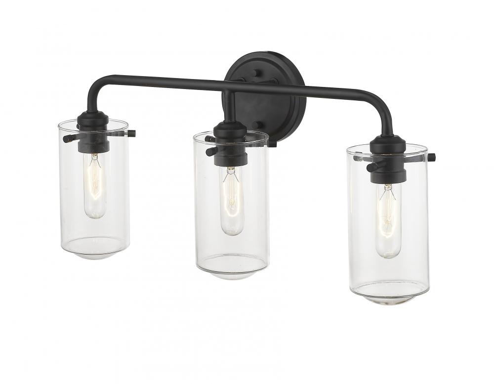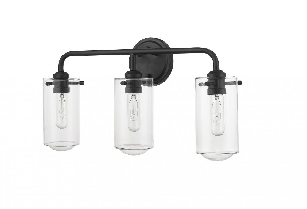 Embrace the industrial artisan flavor of this three-light bath light. With a beautiful matte black finish metal mount and frame, its delicate clear glass shades provide an exquisite accent.