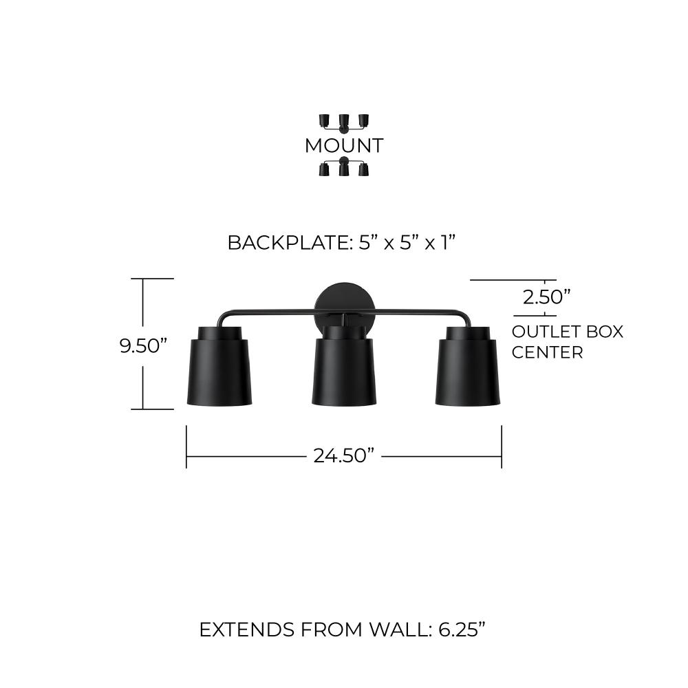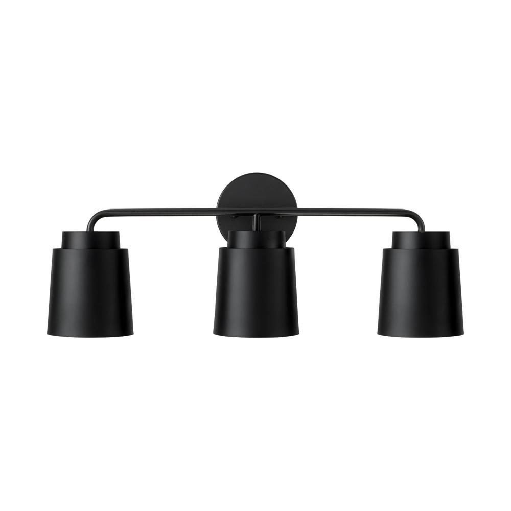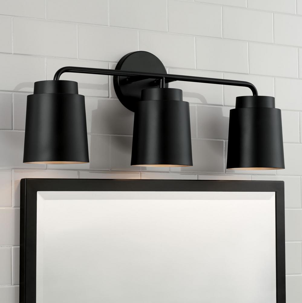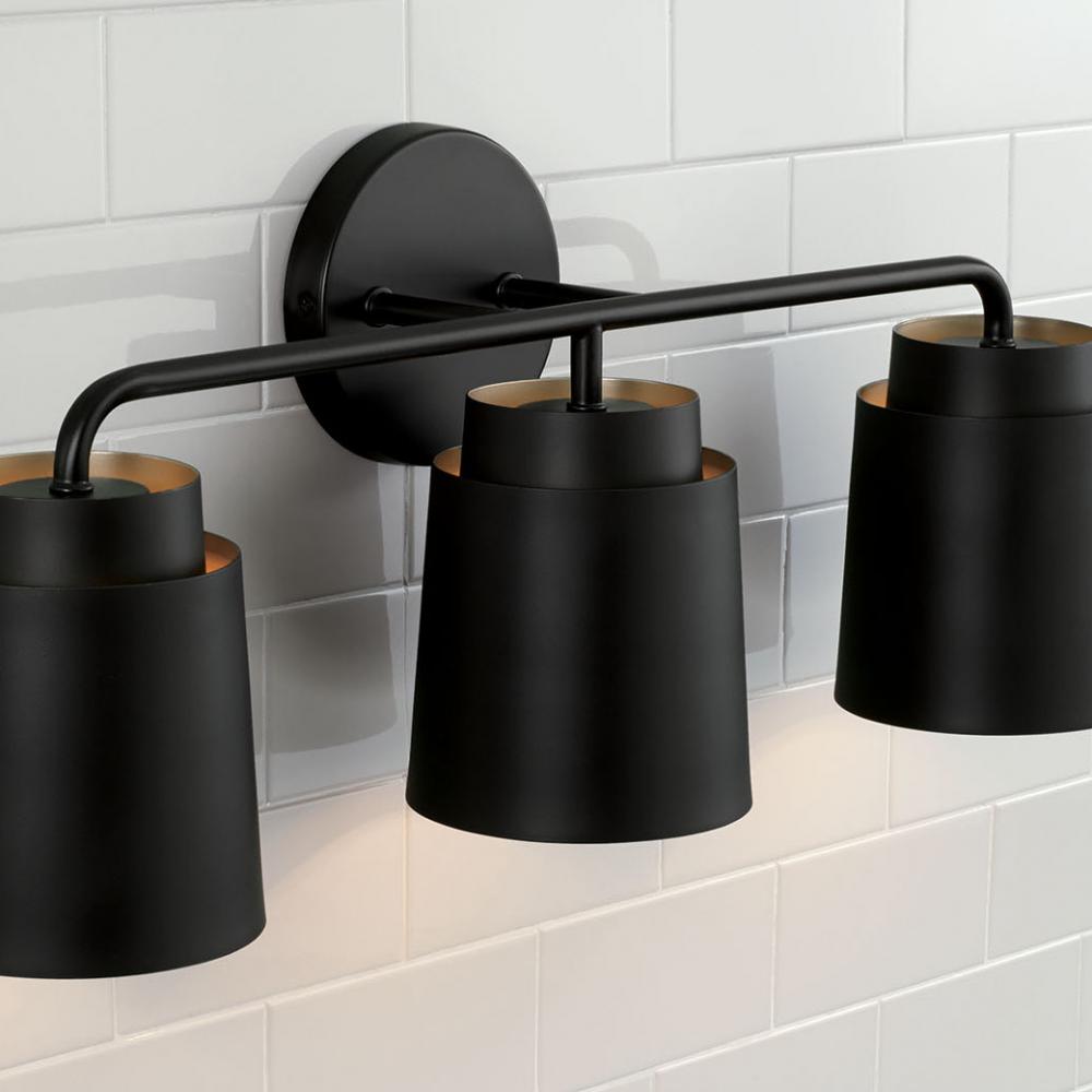 Tapered and concise, the Pratt 3-Light Vanity brings sophisticated style to any powder room. Finished in Matte Black, the tiered metal shades create a sleek aesthetic, while the inner Soft Gold finish invites intriguing dimension.