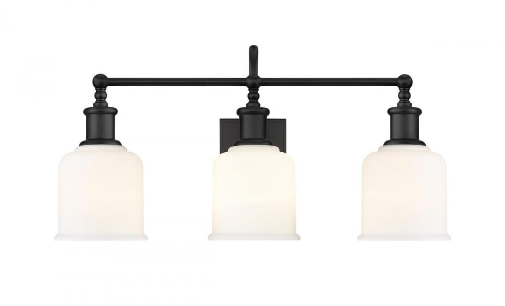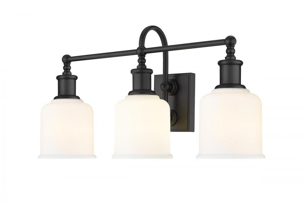 This three-light bath light from the Bryant collection introduces a charming nautical vibe with industrial flavor. Admire a bold matte black finish steel frame and wall mount that create contrasts to opal glass shades. A curved arm, ornate holders, and lipped shades generate extra charm that stylize a custom bath space.