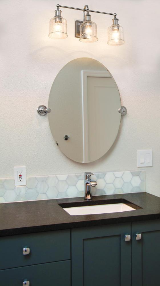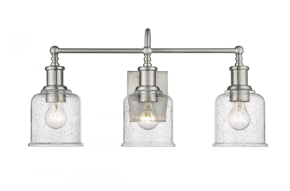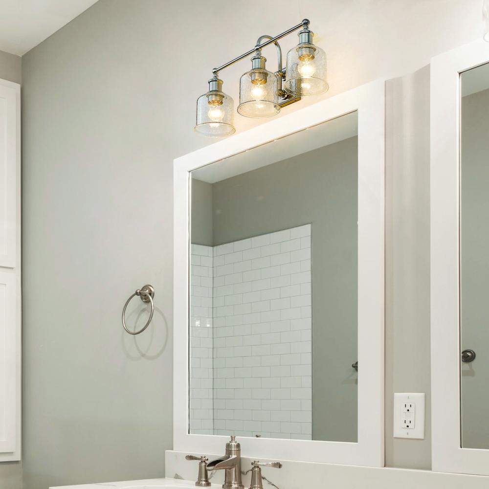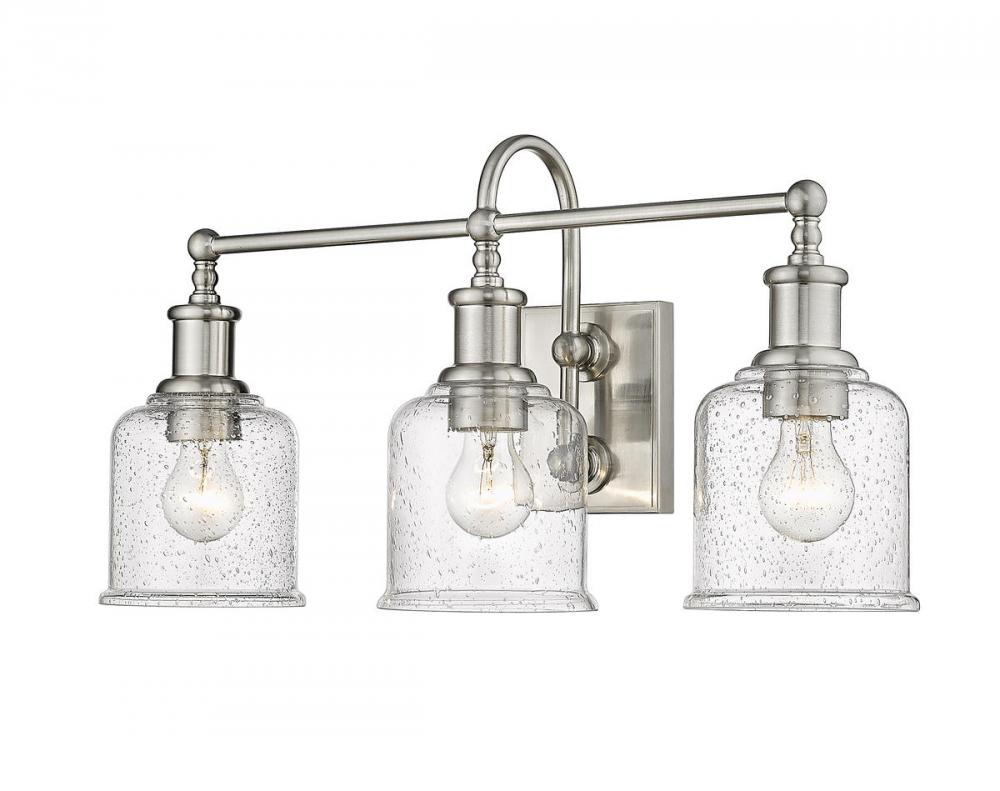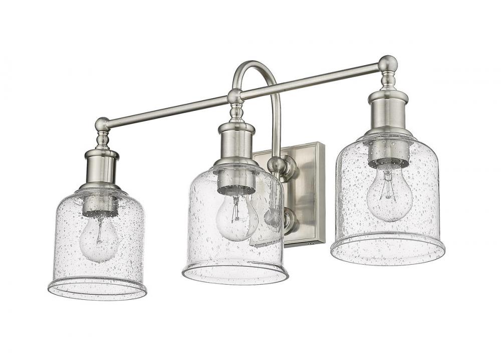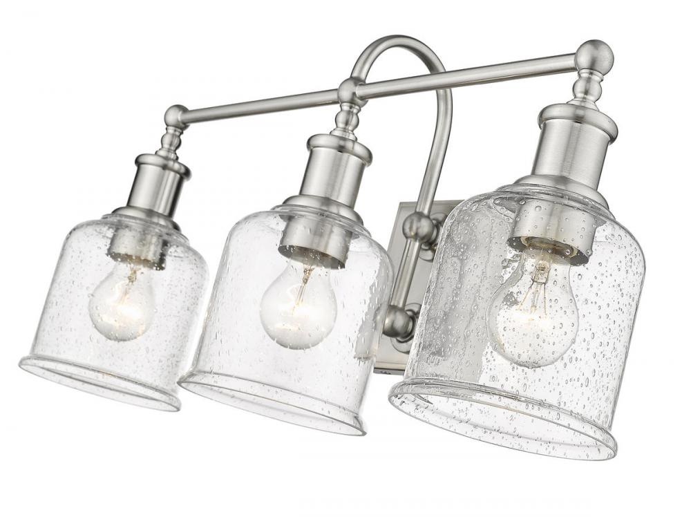 This three-light bath light from the Bryant collection introduces a charming nautical vibe with industrial flavor. Admire a cool brushed nickel finish steel frame and wall mount that complement clear seedy glass shades. A curved arm, ornate holders, and lipped shades generate extra charm that stylize a custom bath space.