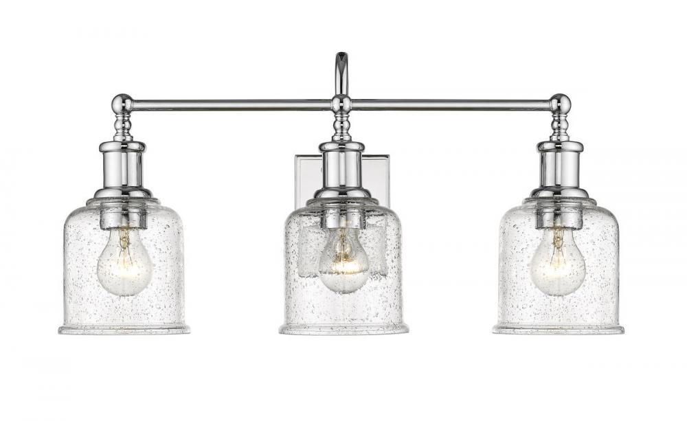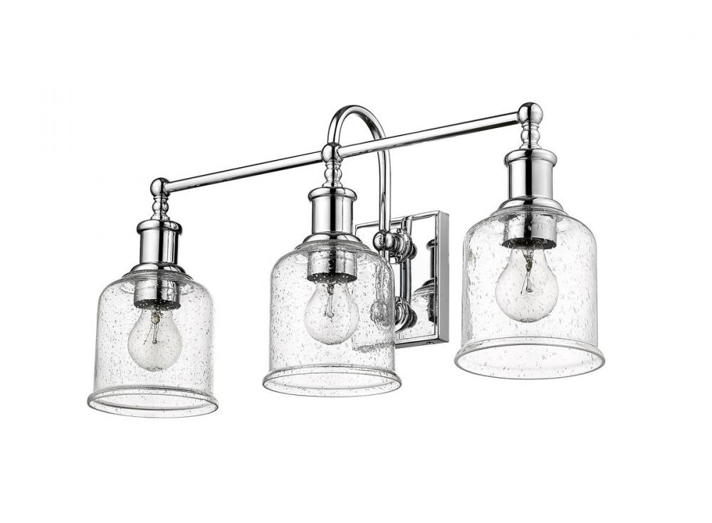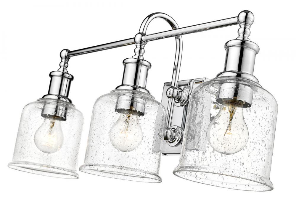 This three-light bath light from the Bryant collection introduces a charming nautical vibe with industrial flavor. Admire a gleaming chrome finish steel frame and wall mount that complement clear seedy glass shades. A curved arm, ornate holders, and lipped shades generate extra charm that stylize a custom bath space.