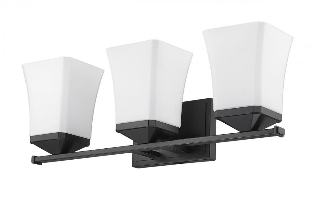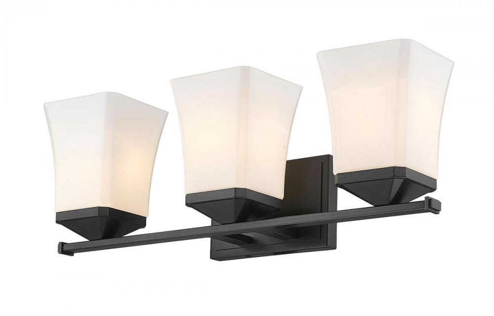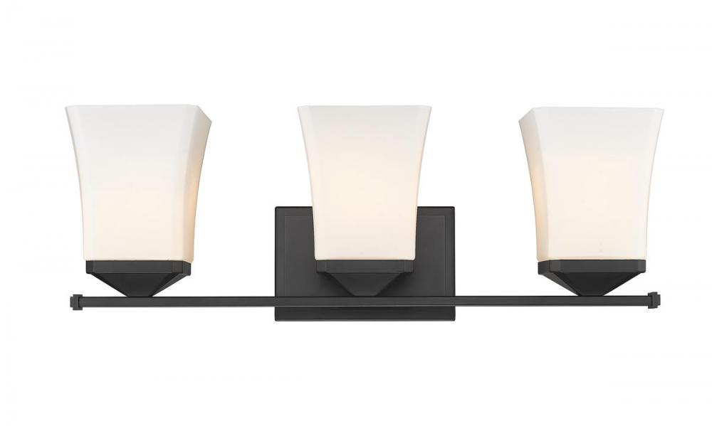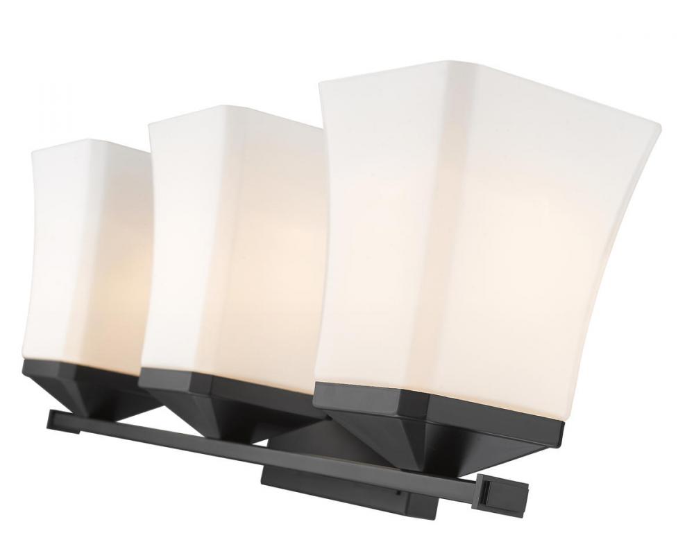 Versatile and stylish, this three-light vanity fixture comes in a matte black finish for an eye-catching display. This piece is made from steel with opal etched glass shades that boast a lovely ripple texture.