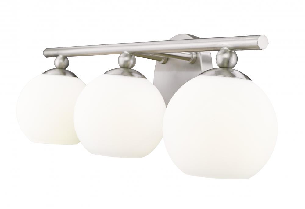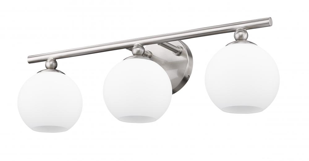Highlight a custom vanity with this contemporary three-light vanity wall light, a classic mix of modern and retro elements that bring festive attitude. From the Neoma collection comes a vanity light ideal for an updated ensuite or guest bath with a craving for attention. Opal etched glass globe shades and a minimalist-inspired brushed nickel finish steel frame join to deliver a stylish look with charming personality.