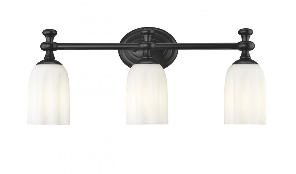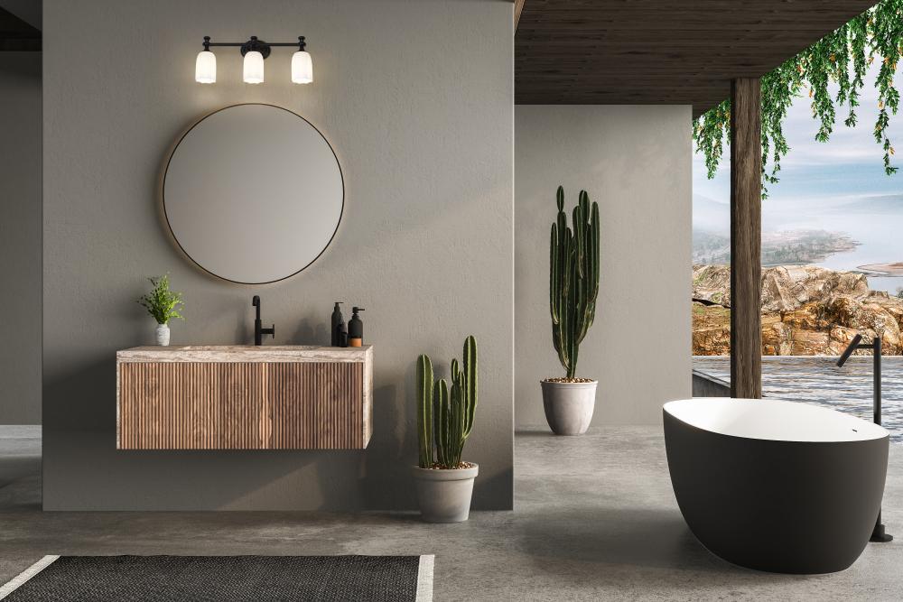 Freshen up the look of your bath with the romantic detail featured in a modern three-light vanity fixture. From the Orion collection, it pairs scalloped detail with opal etched glass, creating soft, diffused illumination and a designer look and feel. A matte black finish adds drama to the overall look of the fixture, perfect for a contemporary vanity.