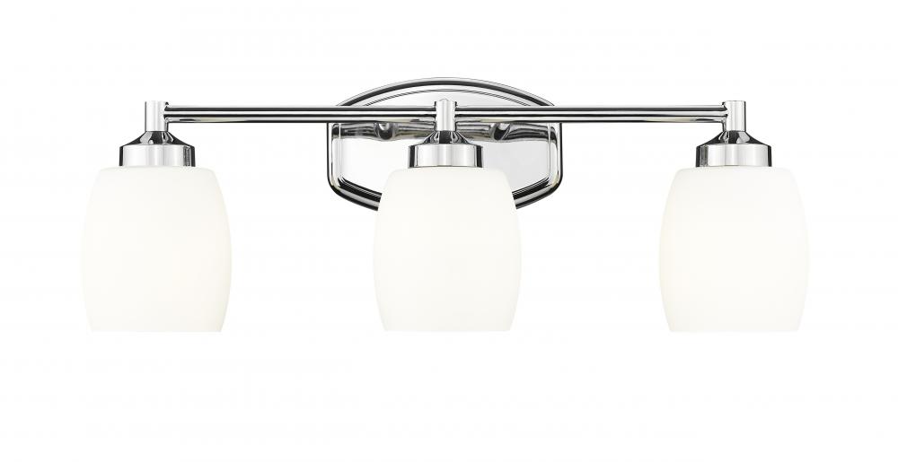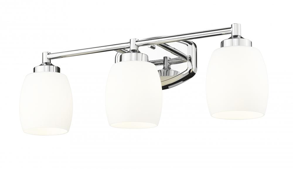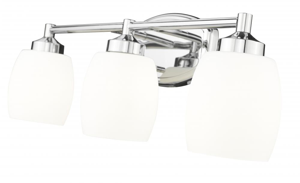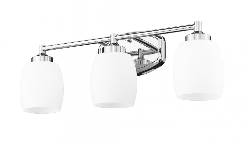 Upgrade your bathroom with a modern three-light vanity fixture. A gleaming chrome finish lends a clean, refined style, while supple curves are embraced in every aspect of its silhouette. Matte opal glass shades diffuse illumination, ensuring the right ambiance for all your morning and evening tasks.
