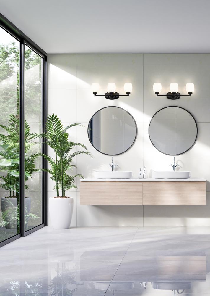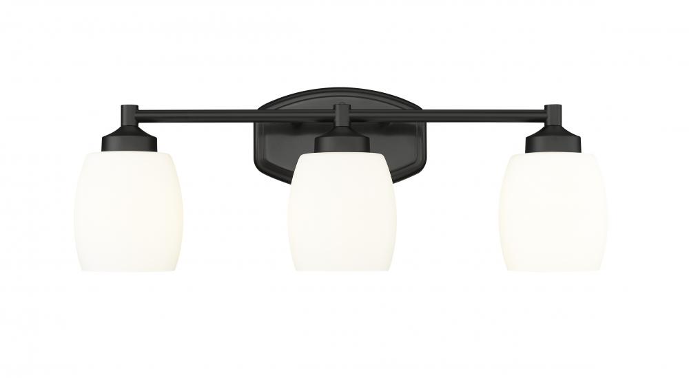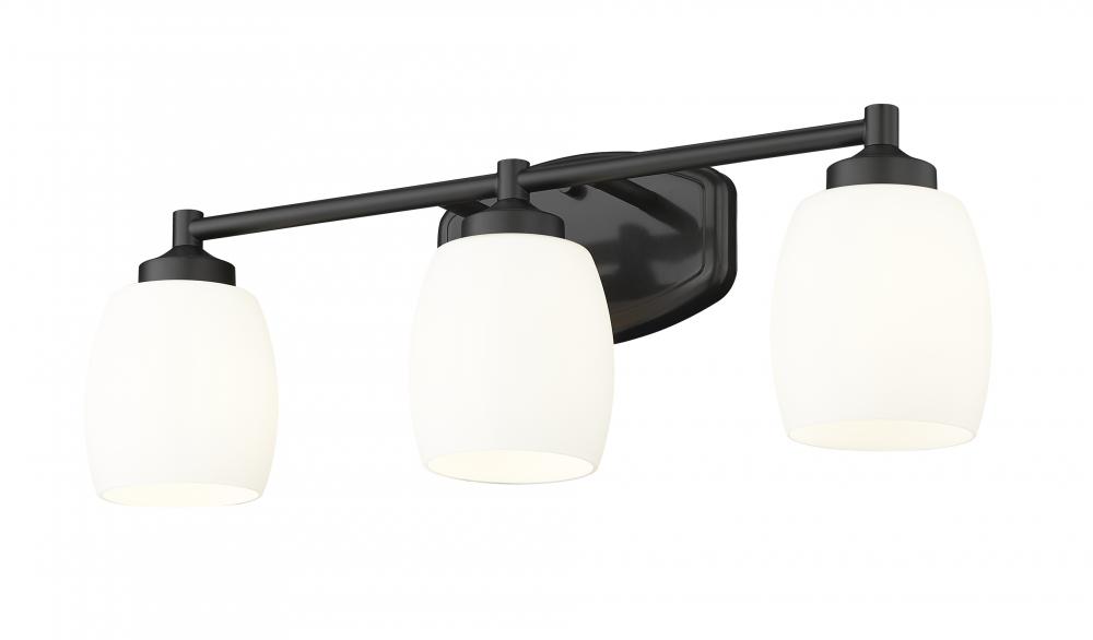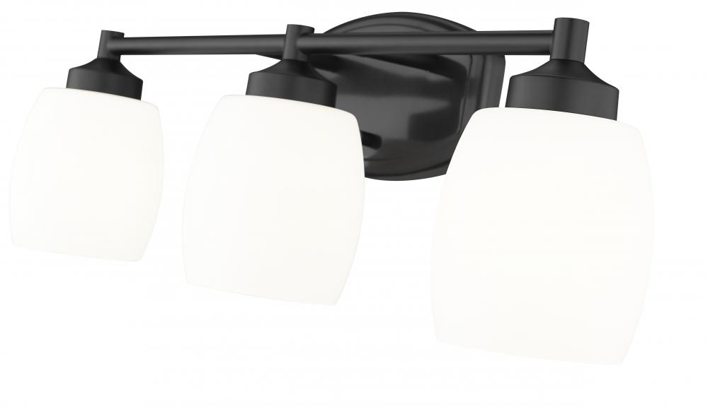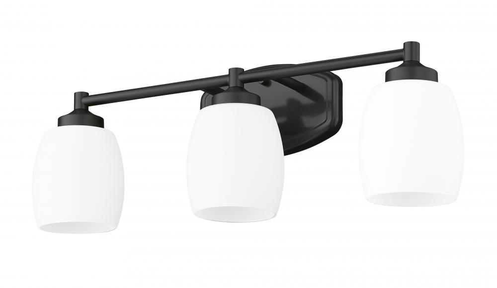 Understated design and subtle curves are the hallmarks of a modern three-light vanity fixture. In matte black for optimal contrast and definition, the fixture features steel construction paired with matte opal shades that diffuse illumination beautifully. Its the ideal solution for a refined, contemporary bathroom space.