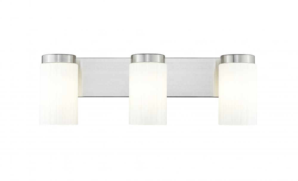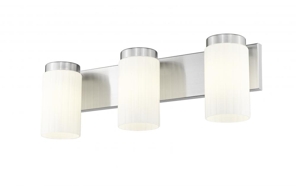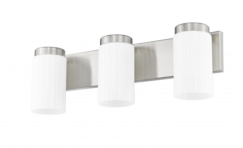 Introduce crisp, bright illumination with the sleek silhouette of a modern three-light vanity fixture from the Burk collection. Its a refined look that instills a refined presence with a simple rectangular wall plate and wide bands, all in a brushed nickel finish. Cylindrical shades add clear opal glass, creating inviting illumination thats wonderful for both ambiance and tasks.